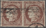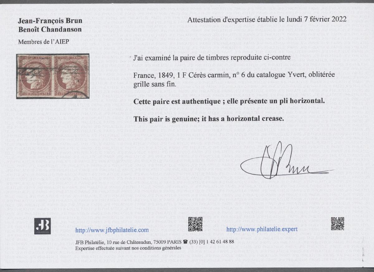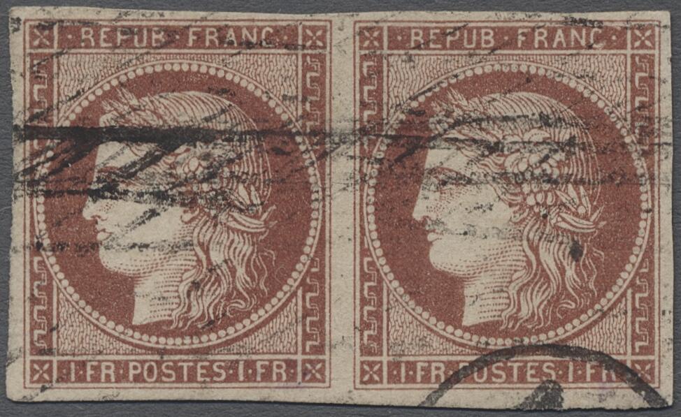 | Zusatzinformationen und Suchstichworte: | Auction Galleries Hamburg 24. Auktion Auktionstermin: 17. - 18. Juni 2022 Los 332 Frankreich 1849, Ceres, 1 Franc karmin, breitrandiges waagerechtes Paar, farbfrisch, voll- bis breitrandig und entwertet mit "Grille sans fin"-Stempel, laut aktuellem Attest Brun (2022) waagerechter (geglätteter) Bug, Yvert 2.350 €. Zuschlag 320,00 |