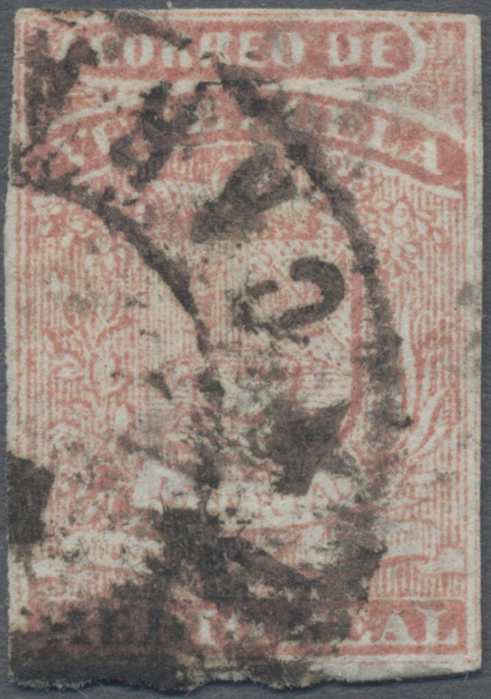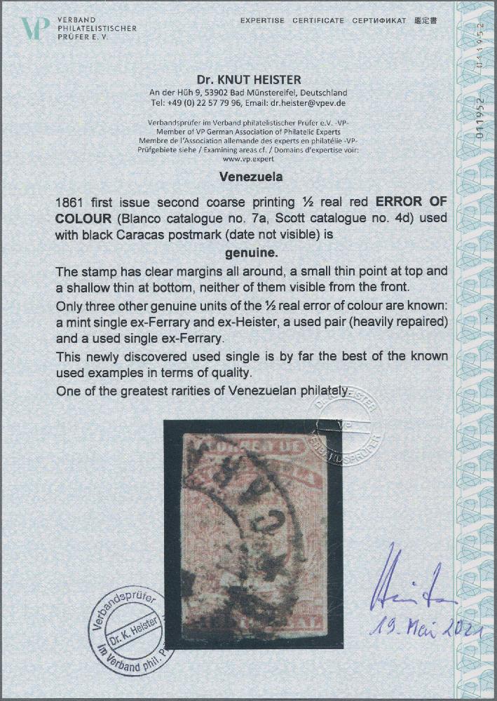 | Zusatzinformationen und Suchstichworte: | Christoph Gärtner 53. Auktion Los 1688 Venezuela 1861 Farbabart: erste Ausgabe zweiter grob Druck ½r. In rot, gebraucht und entwertet durch schwarz Caracas Zweikreisdatumsstempel, mit ringsum saubere Ränder, eine kleine helle Stelle weist oben und ein etwas aufgeraut unten, keiner von ihnen sichtbarer von vorne. Nur drei sonstige Stücke von dieser Farbabart bekannt sind (ein ungebrauchte Einzelmarke ex-Ferrary und ex Heister, ein gestempeltes Paar (schwerer repariert) und ein gestempelte Einzelmarke ex-Ferrary). Dieses neu entdeckt gestempelte Einzelmarke ist weitaus das Beste des bekannten gestempelten Stücken. Ein der größten Raritäten von venezolanisch Philatelie. Dr. Knut Heister Attest (2021) Ausruf 130.000,00 EUR |