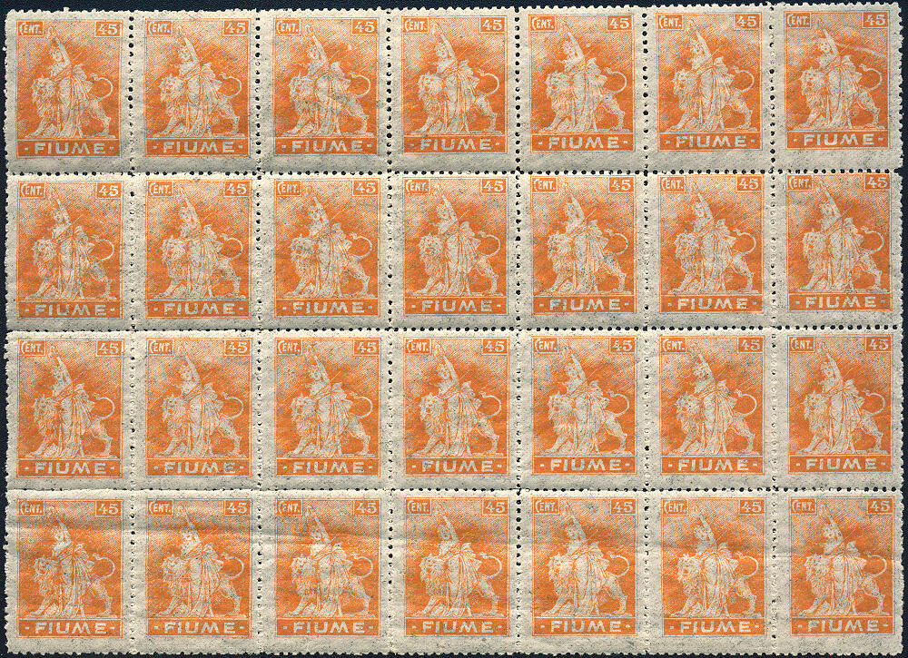 | Zusatzinformationen und Suchstichworte: | Merkurphila 49. Auktion Auktionstermin: 10. - 11. Juni 2022 Los 2073 Italien Königreich Italien - Fiume, 1919, Freimarke 45c orange in postfrischen 28er Block auf semi-transparenten durchscheinenden Papier (sog. carta 'B'), gezähnt 11 1/2 in typischer rauher Zähnung, untere Reihe stärkere Papierwelle, sehr seltene Einheit dieser guten Marke, Attest Martinas (jede Marke einzeln sign.), Sassone Nr.B41, € 17500 Ausruf 600,00 EUR |
