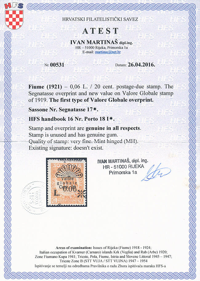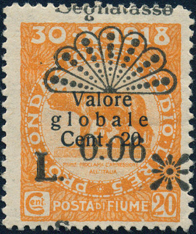 | Zusatzinformationen und Suchstichworte: | Merkurphila 49. Auktion Auktionstermin: 10. - 11. Juni 2022 Los 2077 Italien Königreich Italien - Fiume, 1921, PORTOMARKEN : 0,08L auf 20c mit Type I Aufdruck der valore globale Überdrucke, ungebraucht m. Falzresten, sehr schöne Marke, Attest Martinas, Sassone Nr. 17 € 750 Ausruf 40,00 EUR |