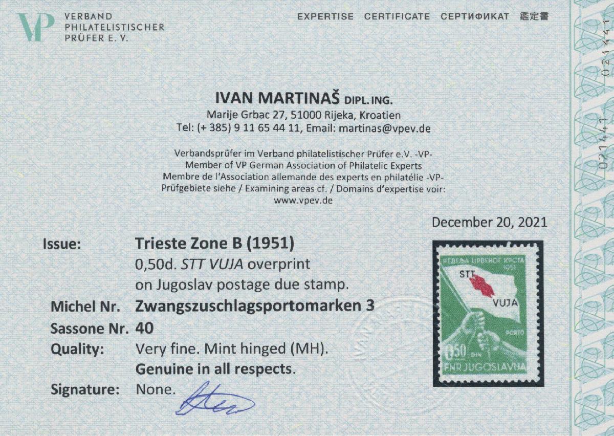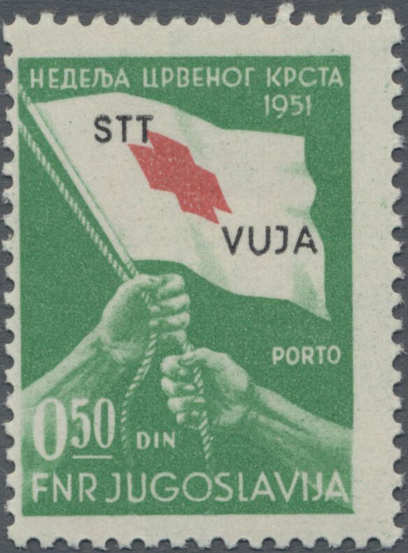 | Zusatzinformationen und Suchstichworte: | Christoph Gärtner 53. Auktion Los 2600 Triest Zone B 1951 jugoslawische Zwangszuschlagsportomarke mit Aufdruck STT VUJA, unsigniert, Falzspuren, Attest Martinas VP Ausruf 100,00 EUR |