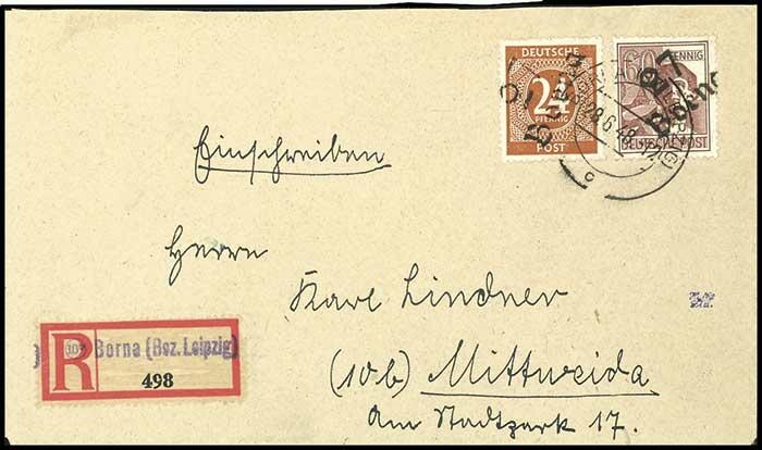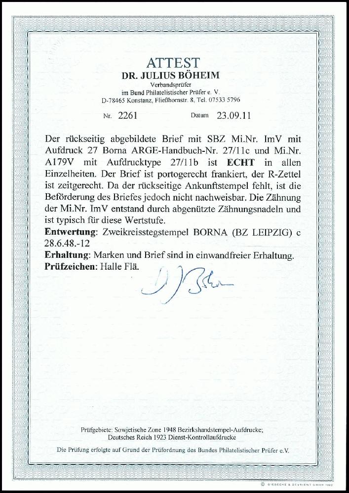 | Zusatzinformationen und Suchstichworte: | Dr. Reinhard Fischer 187. Auktion Auktionstermin: 15. Juli 2022 Los 5915 SBZ Handstempel Bezirk 27 Ziffer 24 und 60 Pfennig mit Aufdruck 27 Borna auf tadellosem, portorichtigen Einschreibebrief, Attest Dr. Böheim BPP, Mi. 1200,- Ausruf 340,00 EUR |