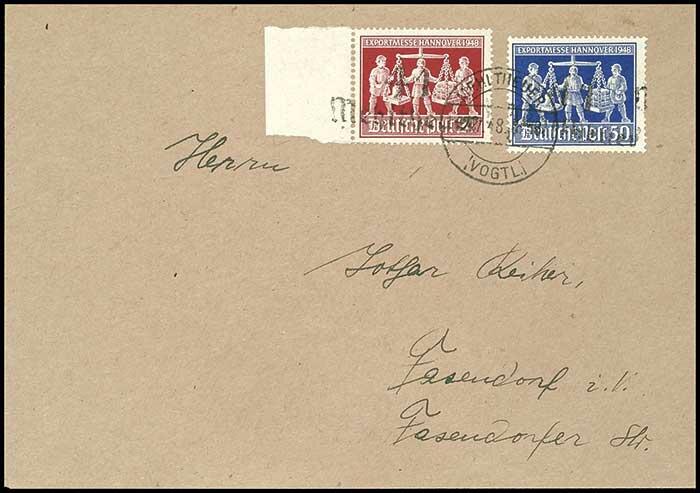 | Zusatzinformationen und Suchstichworte: | Dr. Reinhard Fischer 187. Auktion Auktionstermin: 16. Juli 2022 Los 8731 SBZ Handstempel Bezirk 41 24 und 50 Pfennig Hannovermesse mit Aufdruck 41 Mehltheuer, tadelloser Brief, wegen Überfrankatur nur Marken berechnet, Befund Dr. Böheim BPP, Mi./Arge 235,- Ausruf 100,00 EUR |