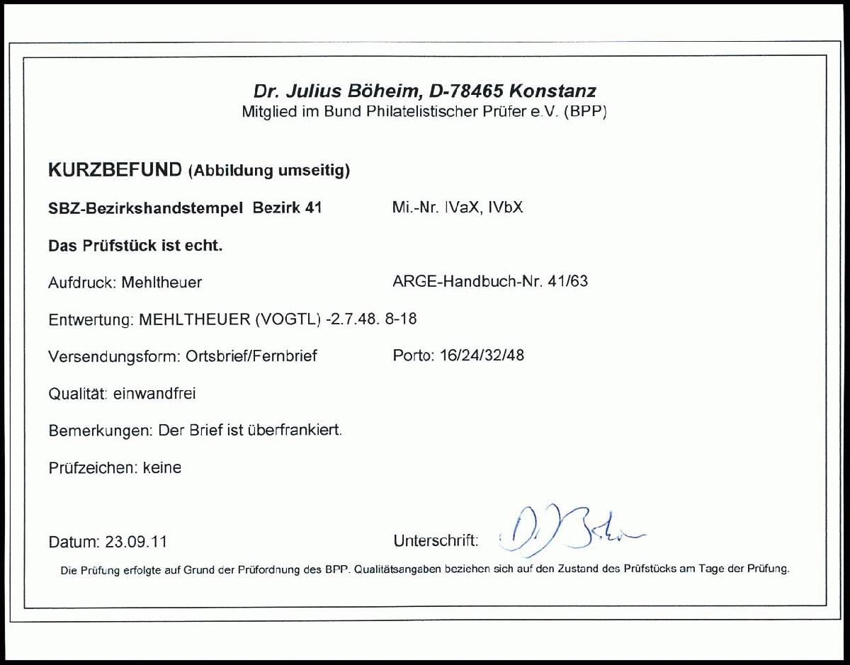 | Prüfgebiet: | Alliierte Besetzung SBZ Bezirkshandstempel Bezirk 41 |
