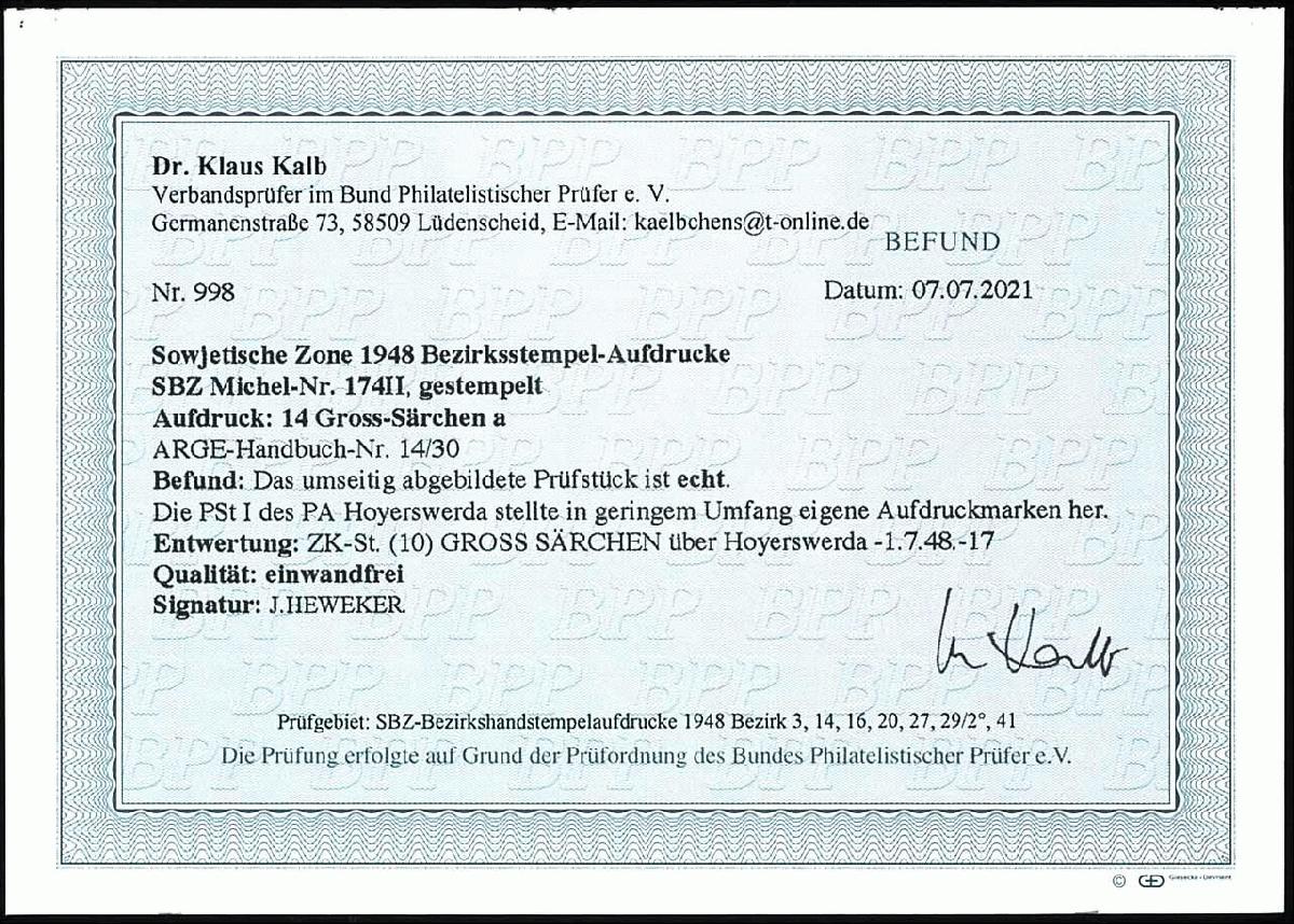 | Prüfgebiet: | Alliierte Besetzung SBZ Bezirkshandstempel Bezirk 14 |