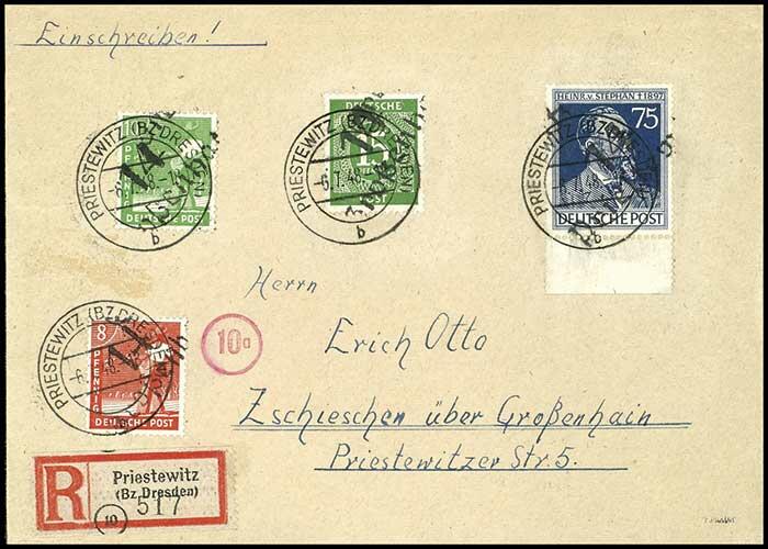 | Zusatzinformationen und Suchstichworte: | Dr. Reinhard Fischer 186. Auktion Auktionstermin: 18. - 21. Mai 2022 Los 3714 SBZ Handstempel Bezirk 14 75 Pfennig Stefan, Ziffer 15 sowie 8 und 10 Pfennig mit Aufdruck 14 Priestewitz sowie 14 Großenhain, tadelloser, portorichtiger Einschreibebrief in der 2. Gewichtsstufe, Fotobefund Dr. Modry BPP, Mi. 1185,- Ausruf 480,00 EUR |