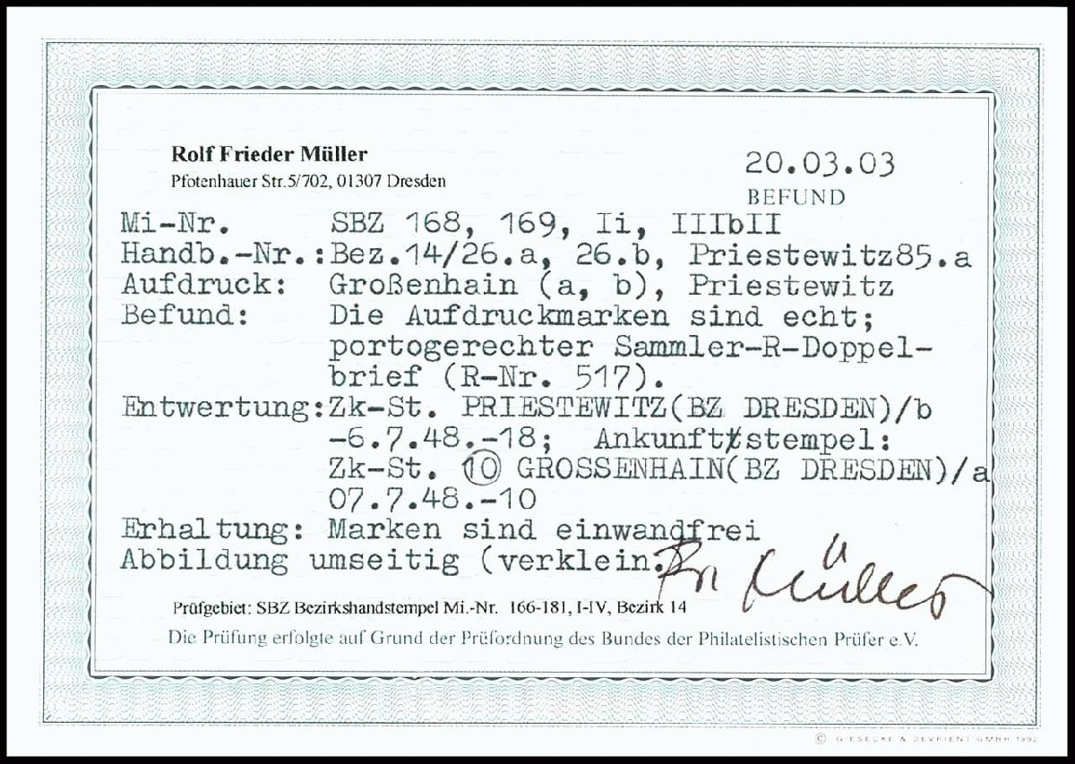 | Prüfgebiet: | Alliierte Besetzung SBZ Bezirkshandstempel Bezirk 14 |