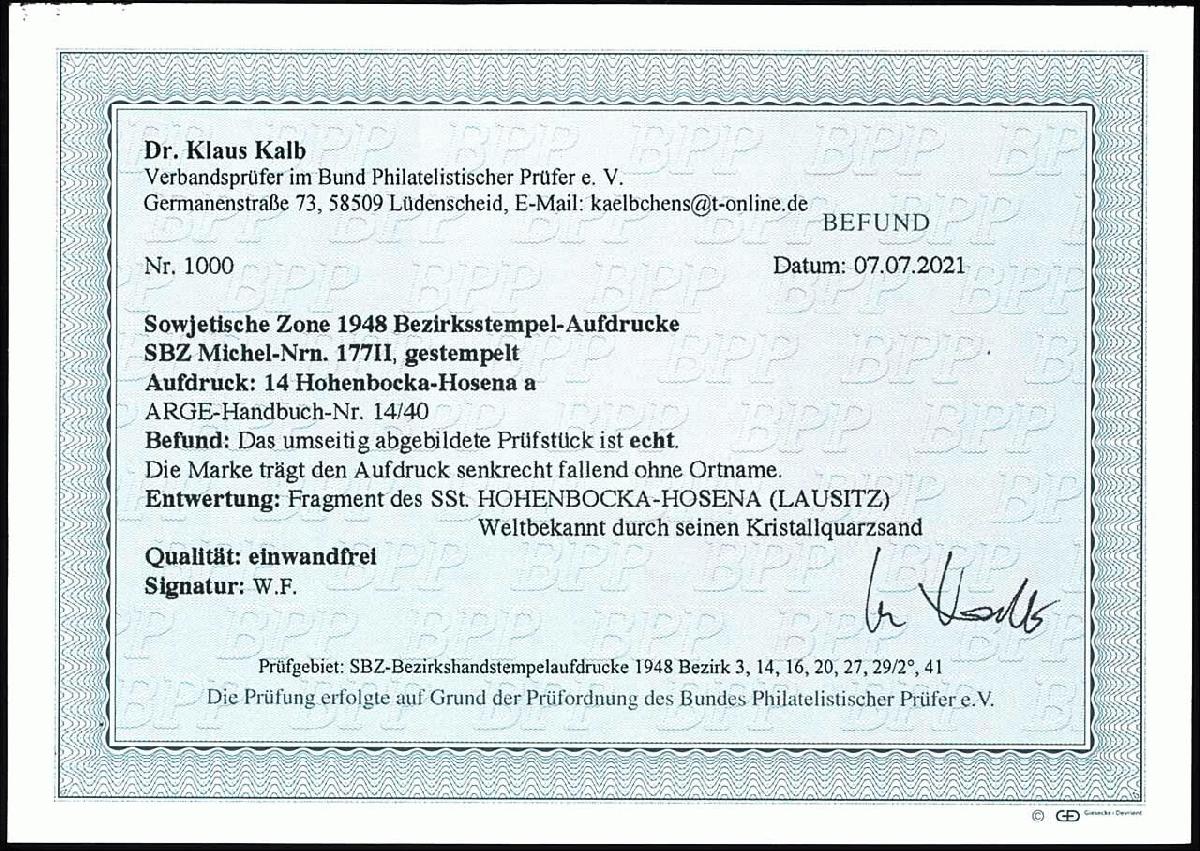 | Prüfgebiet: | Alliierte Besetzung SBZ Bezirkshandstempel Bezirk 14 |