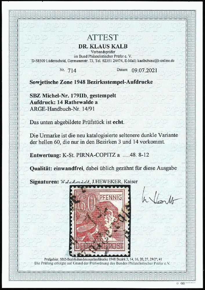 | Zusatzinformationen und Suchstichworte: | Dr. Reinhard Fischer 186. Auktion Auktionstermin: 18. - 21. Mai 2022 Los 3659 SBZ Handstempel Bezirk 14 Helle 60 in der dunklen Variante mit Aufdruck 14 Rathewalde, tadellos, gestempelt, Fotoattest Dr. Kalb BPP, Mi. 500.-Zuschlag 140,00 EUR |