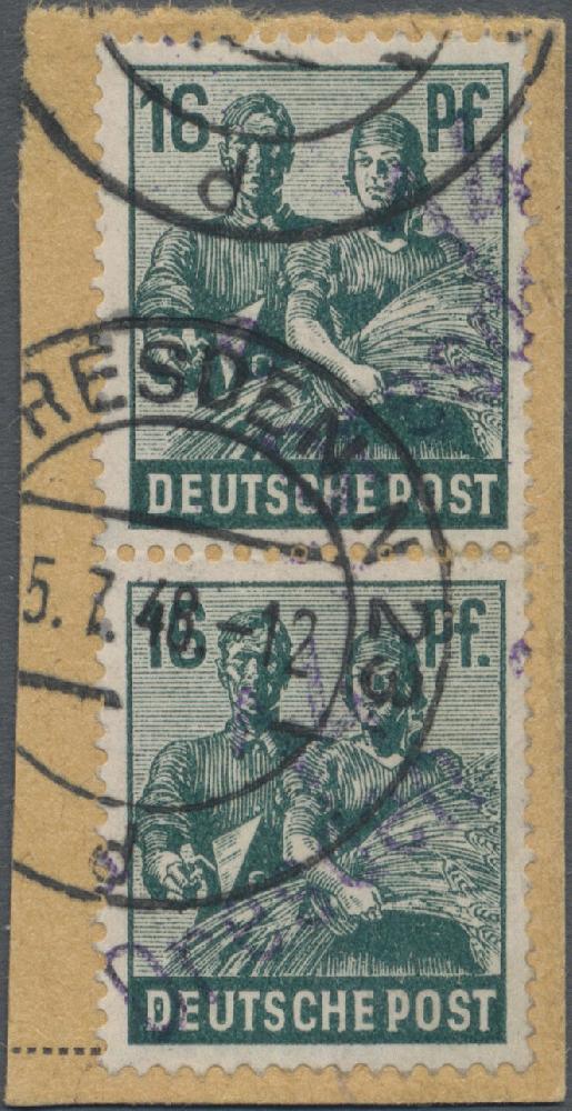 | Zusatzinformationen und Suchstichworte: | Christoph Gärtner 53. Auktion Auktionstermin: 22. Juni 2022 Los 4331 SBZ Handstempel Bezirk 14 14 Dresden 22a: 6 Pfg. Arbeiter mit violettem Handstempel 14 Dresden 22a, senkrechtes Paar herrlich farbfrisch und sehr gut gezähnt auf sehr schönem Paketkartenabschnitt, sauber gest. "DRESDEN 5.7.48.". Von diesem Aufdruck in violett ist nur dieses Paar und eine weitere Marke vom gleichen Abschnitt bekannt geworden. Eine der ganz großen Raritäten der Handstempel und eines der absoluten Schaustücke für die fortgeschrittene Spezial-Sammlung! (Handbuch Nr. 11a violett), Fotoattest Dr. Böheim BPP Ausruf 1.600,00 EUR |
