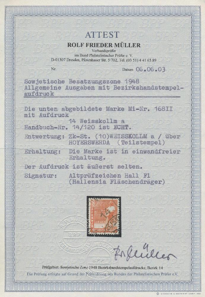| Prüfgebiet: | Alliierte Besetzung SBZ Bezirkshandstempel Bezirk 14 |
