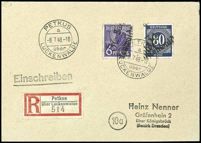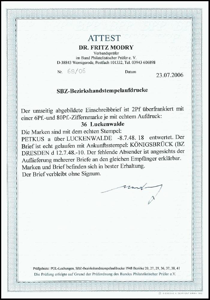 | Zusatzinformationen und Suchstichworte: | Dr. Reinhard Fischer 187. Auktion Auktionstermin: 15. Juli 2022 Los 5929 SBZ Handstempel Bezirk 36 Ziffer 80 und 6 Pfennig mit Aufdruck 36 Luckenwalde auf tadellosem Einschreibebrief mit Ankunftsstempel, Rarität, Fotoattest Dr. Modry BPP, Mi. 2000,- Ausruf 550,00 EUR |