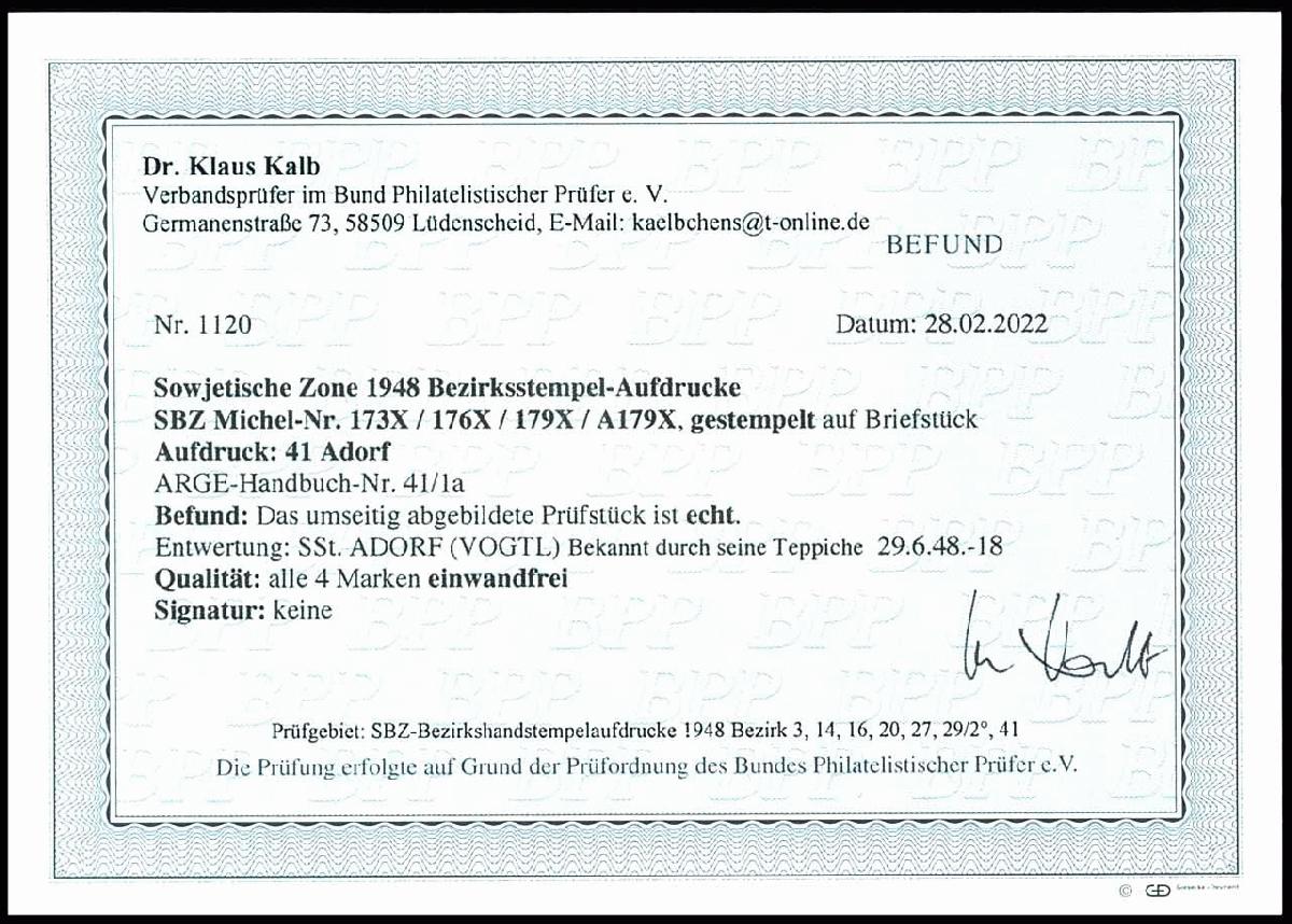 | Zusatzinformationen und Suchstichworte: | Dr. Reinhard Fischer 187. Auktion Auktionstermin: 16. Juli 2022 Los 8491 SBZ Handstempel Bezirk 41 Helle 60 und 20, 30, 60 Pfennig mit Aufdruck 41 Adorf, tadelloses Briefstück, Fotobefund Dr. Kalb BPP, Mi. 420,- Ausruf 160,00 EUR |