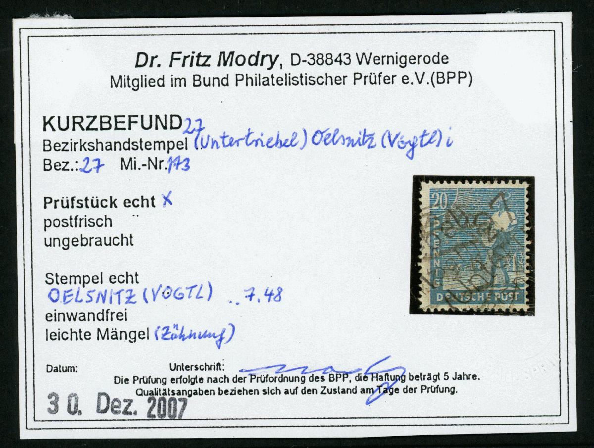 | Prüfgebiet: | Alliierte Besetzung SBZ Bezirkshandstempel Bezirk 27 |