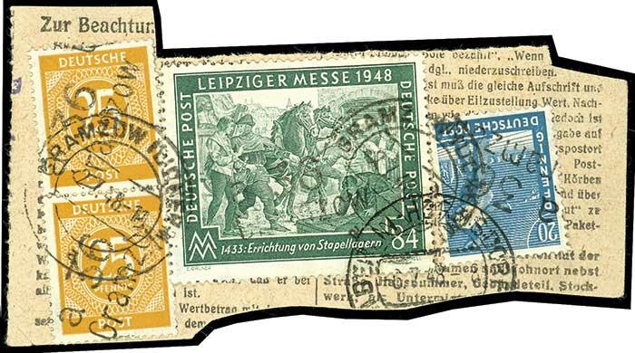 | Zusatzinformationen und Suchstichworte: | Dr. Reinhard Fischer 187. Auktion Auktionstermin: 15. Juli 2022 Los 5930 SBZ Handstempel Bezirk 36 84 Pfennig Leipziger Messe, Ziffer 25 (2) und 20 Pfennig mit Aufdruck 36 Gramzow a, Luxus-Paketkartenabschnitt, nur wenige Stücke dieser Großrarität sind bekannt geworden, die Verwendung erfolgte am 2.7.48 ausschließlich auf Paketkarten, laut Fotoattest handelt es sich um eines der attraktivsten und am besten erhaltenen Stücke der Mi.Nr. IIId, in dieser Qualität wohl nicht wieder zu beschaffen und total unterbewertet, der ursprüngliche Kaufpreis des Einlieferers betrug 15.000,- EUR, Fotoattest Dr. Böheim BPP, Mi. 12300,- +++ Ausruf 10.000,00 EUR |