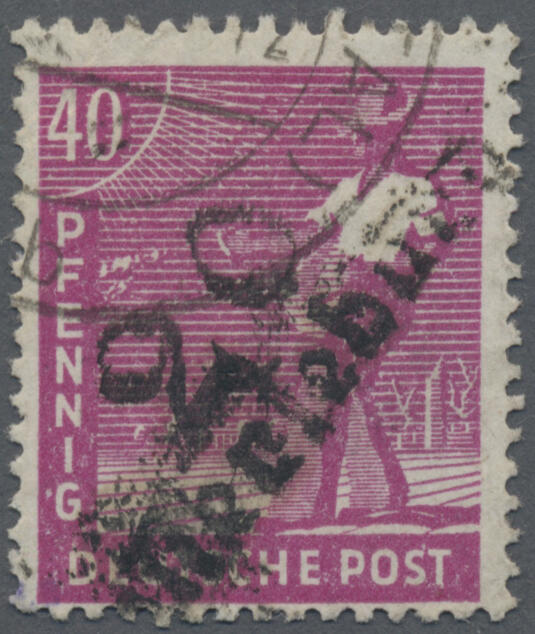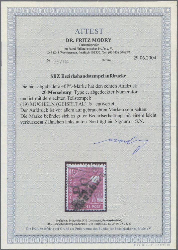 | Zusatzinformationen und Suchstichworte: | Christoph Gärtner 53. Auktion Auktionstermin: 22. Juni 2022 Los 4349 SBZ Handstempel Bezirk 20 20 Merseburg: 40 Pfg. Arbeiter mit Handstempel 20 Merseburg, seltene Type c mit abgedecktem Numerator, eine Zahnspitze belanglos verkürzt, soweit tadellos gest. Ein außerordentlich seltener Handstempel, der vor allem auf gebrauchten Marken kaum einmal hervorkommt, (Handbuch Nr. 103c), Fotoattest Dr. Modry BPP Zuschlag 180,00 EUR |
