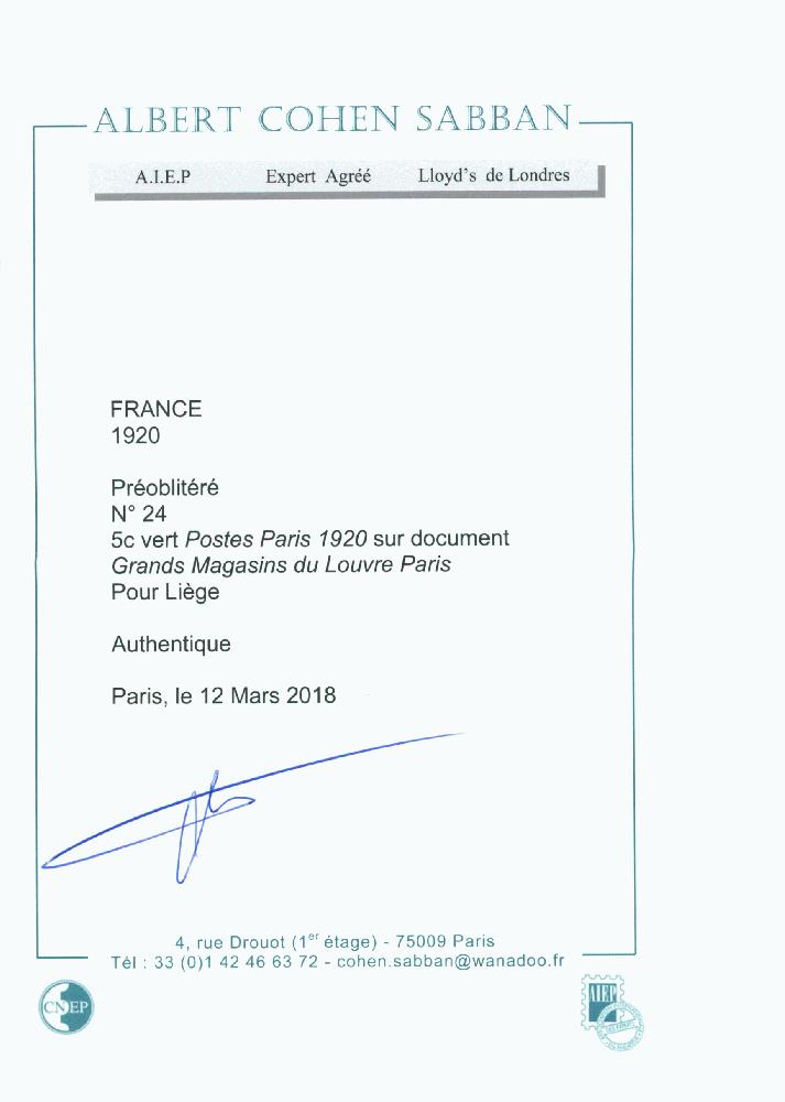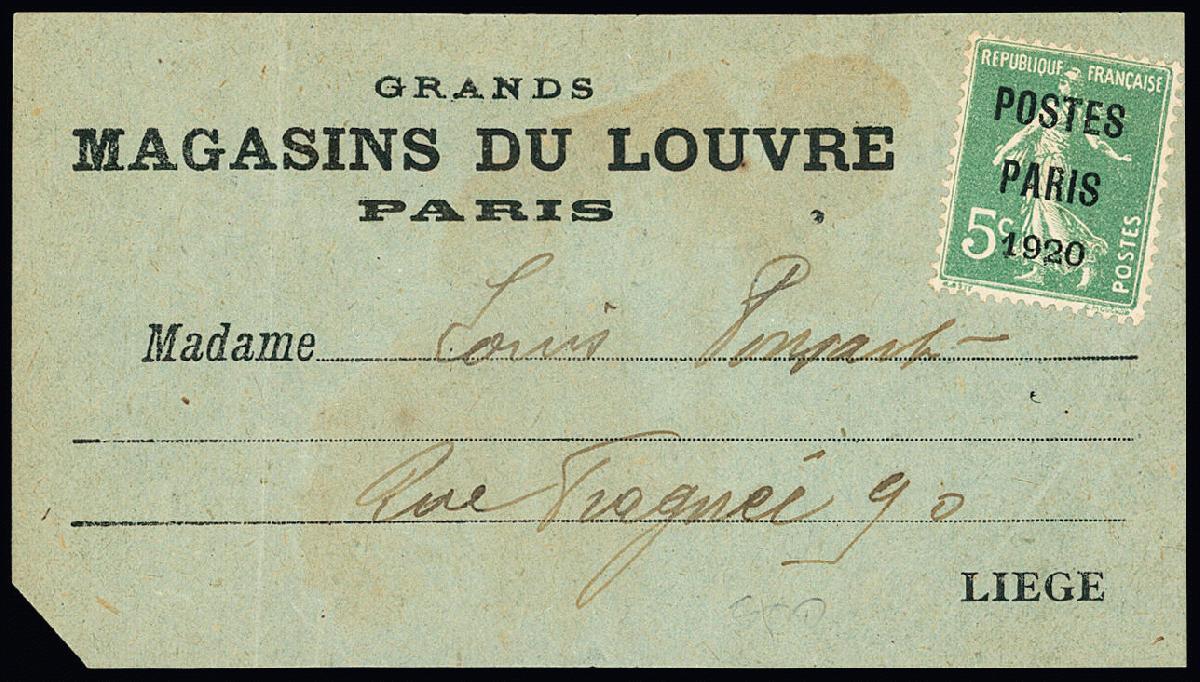 | Zusatzinformationen und Suchstichworte: | Le Timbre Classique Paris - 40. Fernauktion Auktionstermin: 30. Juni 2022 Los 3999 Frankreich N°24 5c vert POSTES PARIS 1920 sur document Grands Magasins du Louvre Paris pour Liège, Belgique, TB, R sur document, cert. Cohen Sabban Ausruf 125,00 EUR |