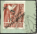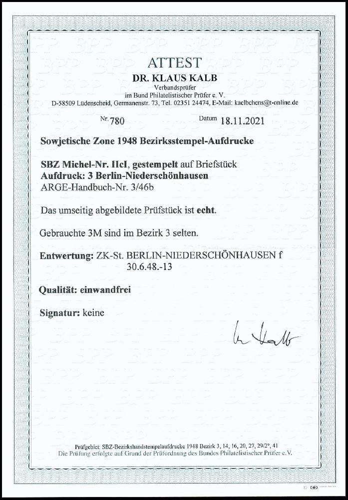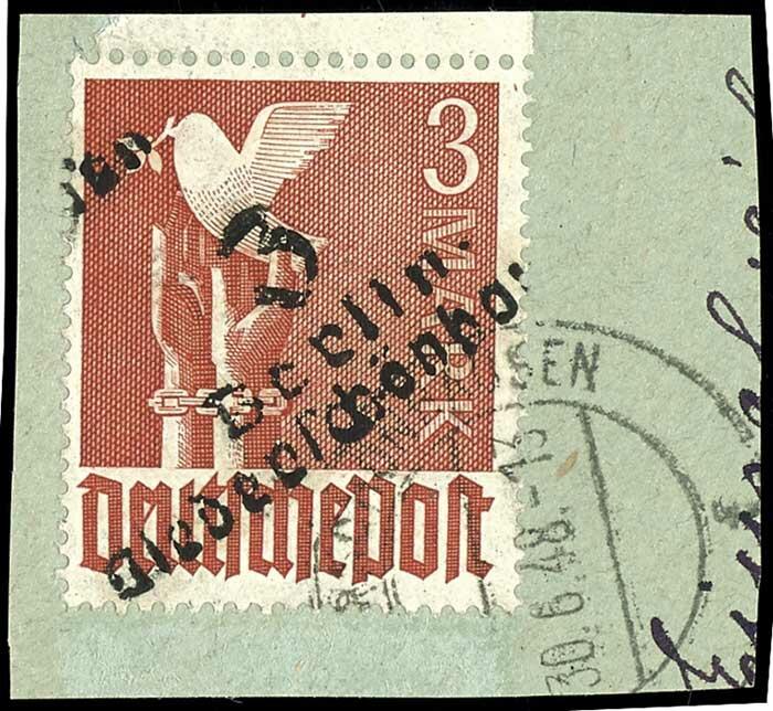 | Zusatzinformationen und Suchstichworte: | Dr. Reinhard Fischer 186. Auktion Auktionstermin: 18. - 21. Mai 2022 Los 3708 SBZ Handstempel Bezirk 3 3 Mark mit Aufdruck 3 Berlin-Niederschönhausen, Luxusbriefstück, Fotoattest Dr. Kalb BPP, Mi. 800,- Ausruf 380,00 EUR |
