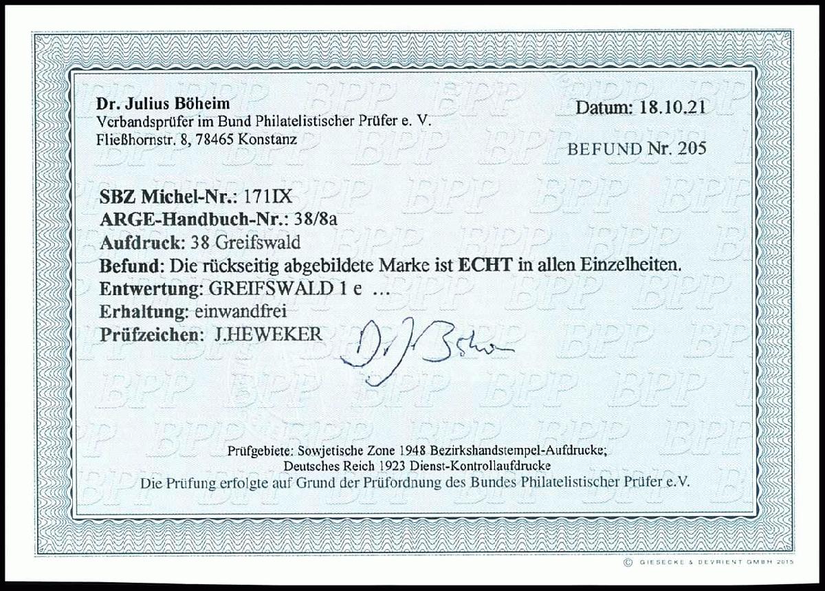 | Zusatzinformationen und Suchstichworte: | Dr. Reinhard Fischer 186. Auktion Auktionstermin: 18. - 21. Mai 2022 Los 3705 SBZ Handstempel Bezirk 38 15 Pfennig mit Aufdruck 38 Greifswald, tadellos, gestempelt, aktuelles Fotoattest Dr. Böheim BPP, Mi. 450,- Ausruf 150,00 EUR |