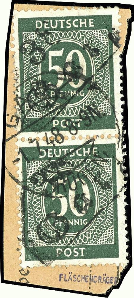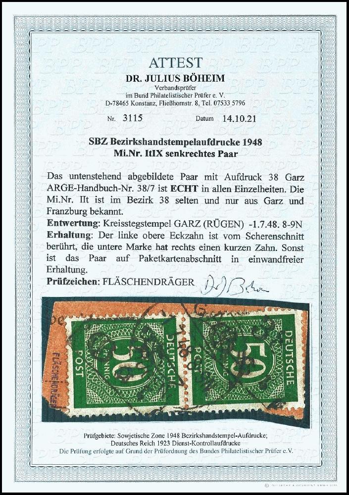 | Zusatzinformationen und Suchstichworte: | Dr. Reinhard Fischer 186. Auktion Auktionstermin: 18. - 21. Mai 2022 Los 3749 SBZ Handstempel Bezirk 38 Ziffer 50 im senkrechten Paar mit Aufdruck 38 Garz auf Paketkartenabschnitt, winzige Zahnunebenheit, sonst tadellos, sehr selten, aktuelles Fotoattest Dr. Böheim BPP, Mi. 2200,- Ausruf 450,00 EUR |