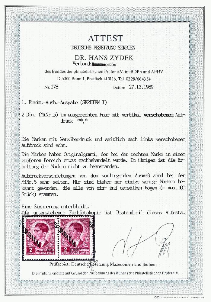 | Zusatzinformationen und Suchstichworte: | Dr. Reinhard Fischer 187. Auktion Auktionstermin: 15. Juli 2022 Los 4883 Deutsche Besetzung II. WK Serbien 2 Din. (Paar) in postfrischer Erhaltung, wobei die rechte Marke etwas nachbehandelt wurde, mit stark verschobenem Aufdruck SERBIEN, Attest Zydek "Aufdruckverschiebungen von dem vorliegenden Ausmaß sind bei der MiNr. 5 sehr selten." Mi. 800.- Ausruf 150,00 EUR |