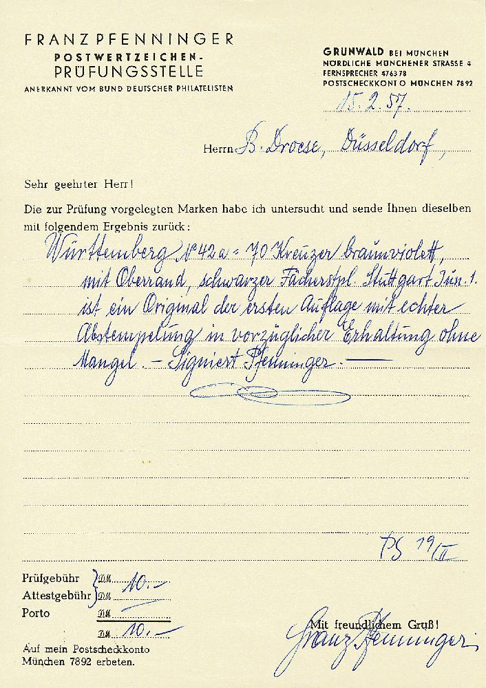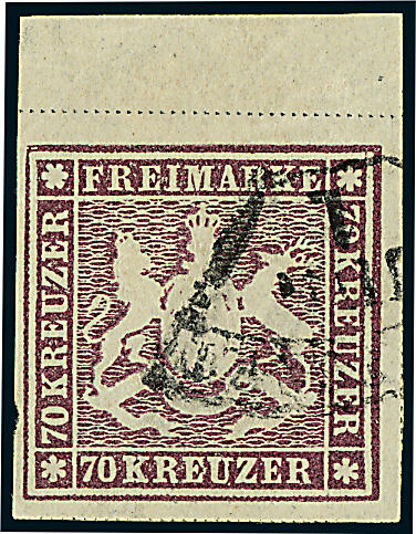 | Zusatzinformationen und Suchstichworte: | Dr. Derichs 5. Online Live Auktion Auktionstermin: 10. Juli 2022 Los 2247 Altdeutschland Württemberg 70 Kr. braunlila, gute "a"-Farbe, von Bogenfeld 1 stammend, Oberrandstück mit 7mm breitem Bogenrand, auch an den anderen drei Seiten voll- bis breitrandig, sauber gestempelt mit schwarzem Fächerstempel "Stuttgart Jun.1". Luxus. Laut Vorschrift sollten die Bogenränder vor dem Gebrauch abgeschnitten werden und demzufolge sind Randstücke wie das hier gezeigte Exemplar von großer Seltenheit. Tiefst geprüft Pfenninger mit Attest (1957) und neues Fotoattest Heinrich BPP: "Echt und einwandfrei... Gebrauchte 70 Kr.-Marken mit Bogenrand sind ausgesprochen selten!". (Michel 7.000.-+++, das ist der Preis für eine normale Marke ohne Aufschlag für den großen Oberrand.) Ausruf 2.500,00 EUR |