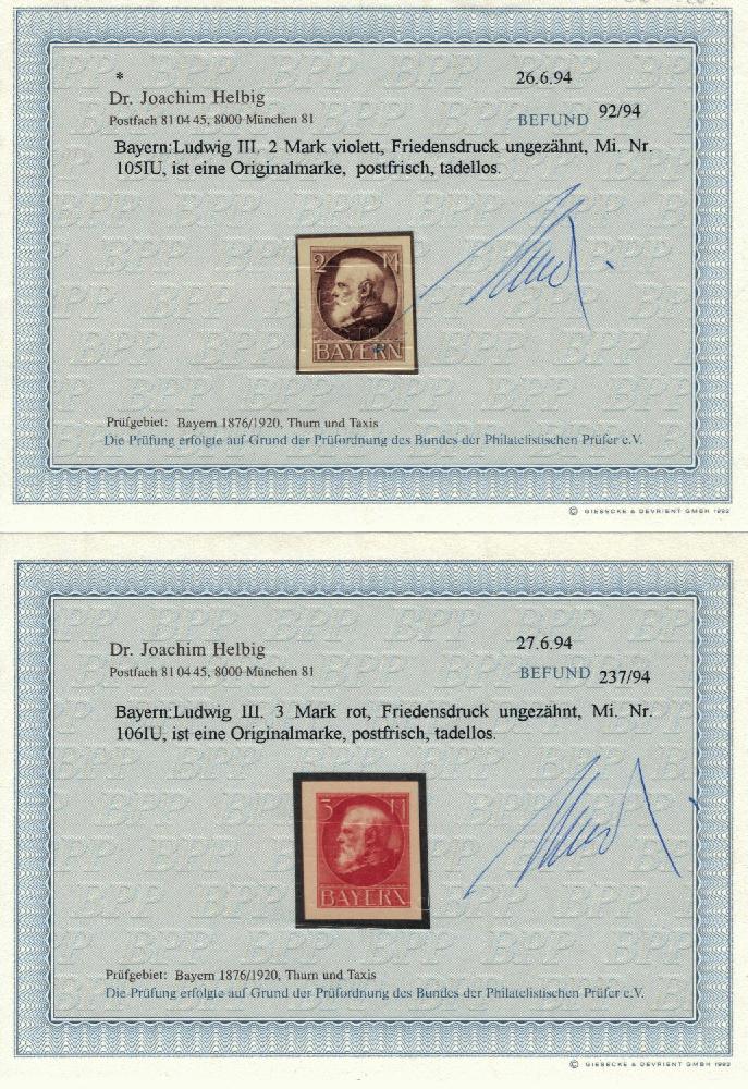| Zusatzinformationen und Suchstichworte: | Dr. Derichs 5. Online Live Auktion Auktionstermin: 10. Juli 2022 Los 3121 Altdeutschland Bayern 2 und 3 Mk. "Ludwig III.", Abart "UNGEZÄHNT", postfrische Luxusstücke. Zwei Fotobefunde Dr. Helbig BPP: "postfrisch, tadellos". (Michel 270.-) Ausruf 100,00 EUR |