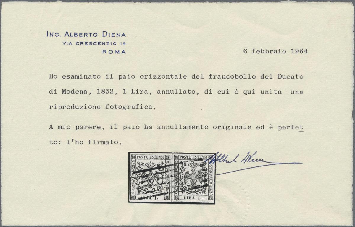 | Zusatzinformationen und Suchstichworte: | Christoph Gärtner 53. Auktion Los 2108 Italien Staaten Modena ÷ 1852, 1 Lira schwarz auf weiß, waagerechtes Paar mit schwarzem Balkenstempel (6 Balken) aus dem Herzogtum Modena. Die Einheit ist gut gerandet, rückseitig leicht fleckig, ansonsten perfekt. Paare dieser Marke gehören zu den Großraritäten der altitalienischen Staaten und der klassischen Philatelie weltweit. Wir schätzen, dass es nur 6-7 Paare auf dem Philamarkt existieren. Signiert Emilio Diena, Giiulio Bolaffi, Atteste Alberto Diena (1964) und Colla Asinelli (1983) Zuschlag 5.000,00 EUR |