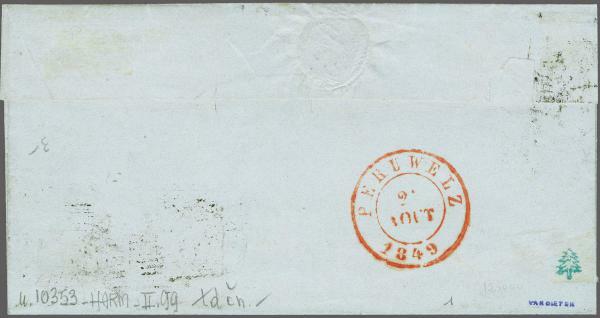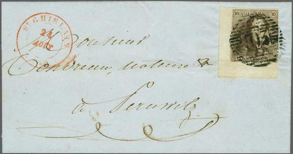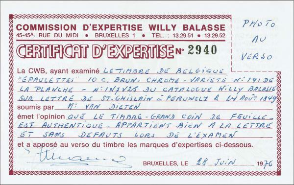 | Zusatzinformationen und Suchstichworte: | 284. - 290. Corinphila Auktion Auktionstermin: 2. Juni 2022 1849 (Aug 24): Cover from St. Ghislain to Péruwelz, bearing Epaulettes 10 c. brown-chrome (COB 1g) from position 191 of the printing sheet of 200 showing variety: '0' of '10' doubled (COB 1-V5), a superb example with good to large margins, corner marginal with partial watermark at lower left, tied by barred '103' numeral with St. Ghislain despatch cds in red alongside. Reverse with clear PERUWELZ arrival cds in red from the following day. A most attractive usage between two villages in the province de Hainaut. Signed van Dieten; cert. Balasse (1976) Zuschlag 24.000,00 CHF |