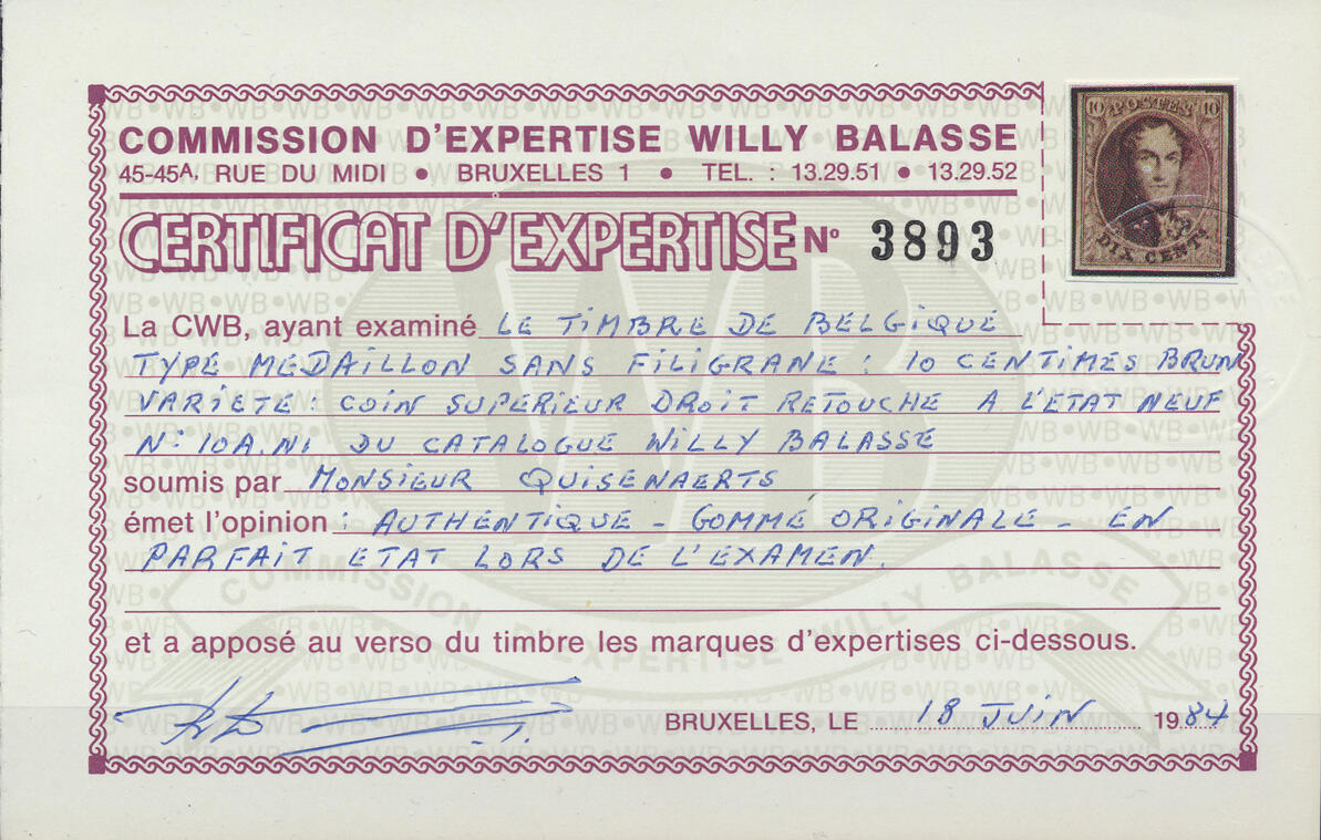 | Zusatzinformationen und Suchstichworte: | 171. Van Looy Auktion Auktionstermin: 15. - 18. Juni 2022 Los 74 Belgien 1851 Medallion "N° 10A "10c. bruin", zeer goed gerand en met originele gom, zeer frisse zegel met keurmerk Diena en fotocertificaat W. Balasse, zm (OBP €1.875)" Zuschlag 520,00 EUR |