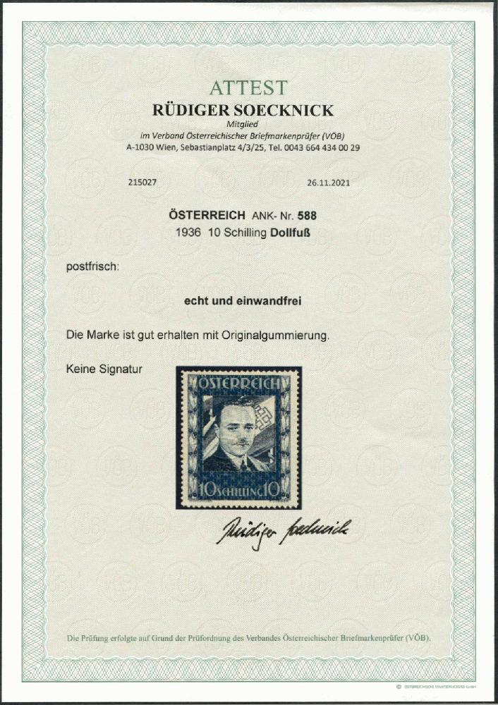 | Zusatzinformationen und Suchstichworte: | 108. Briefmarken Lenz Auktion Auktionstermin: 29. April - 5. Mai 2022 Los 1425 Österreich 1936, 10 S. Dollfuss, Echt und Einwandfrei, Attest Soecknick VÖB, Mi.1.400,- Zuschlag 350,00 EUR |