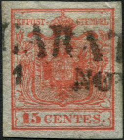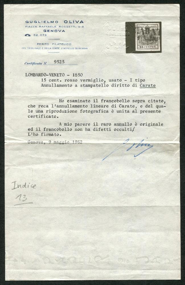 | Zusatzinformationen und Suchstichworte: | 108. Briefmarken Lenz Auktion Auktionstermin: 29. April - 5. Mai 2022 Los 1756 Österreich Lombardei Venetien "CARATE", extrem seltener L2 (nur E fehlt), fast voll, klar auf 15 Cent. Type 1, Pracht, Attest Oliva (Altprüfer aus Genua), Index 1 (= 2'750,-) Zuschlag 150,00 EUR |