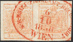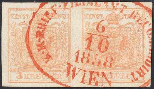 | Zusatzinformationen und Suchstichworte: | 70. Deider Auktion Auktionstermin: 18. - 19. Mai 2022 Los 302 Österreich Ausgabe 1850 3 Kr. rot, breitrandiges, waager. Paar, mit klarem, leuchtend rotem Teil-Ovalstempel "K.K. BRIEF-FILIALAMT RECOMANDIRT/1858/WIEN", sign. und Attest Matl (180 P.) Zuschlag 250,00 EUR |