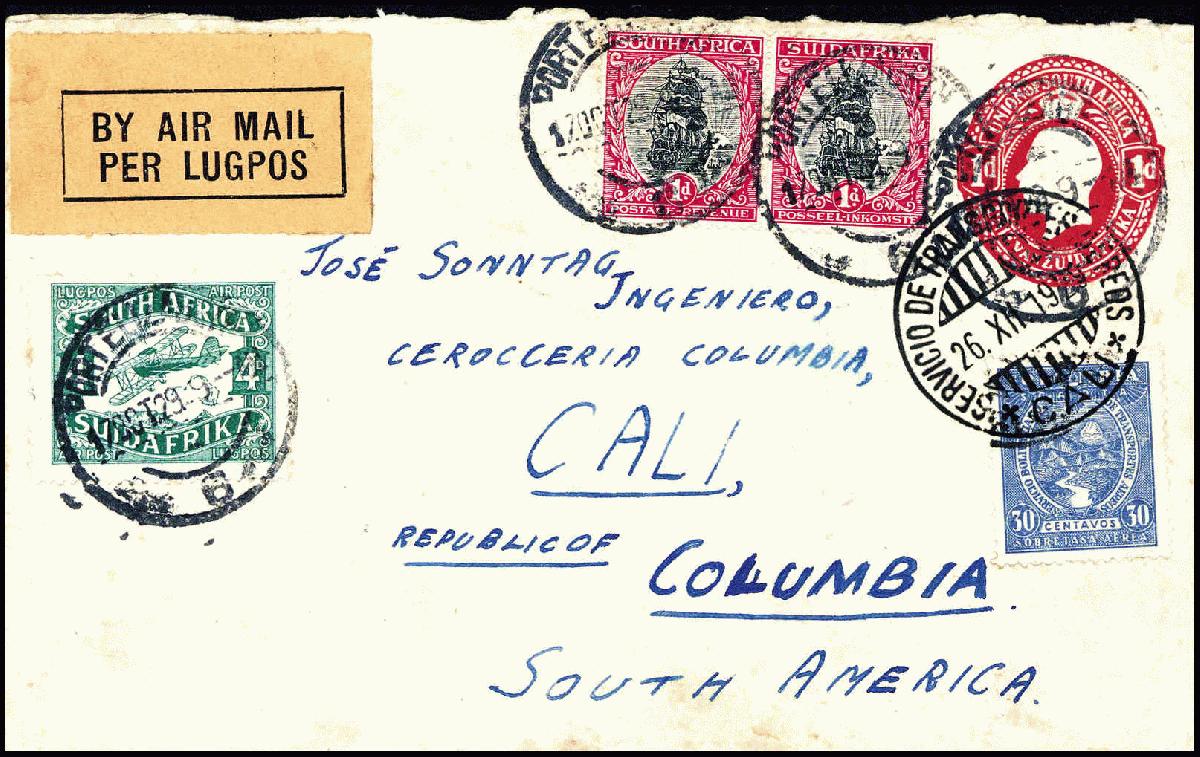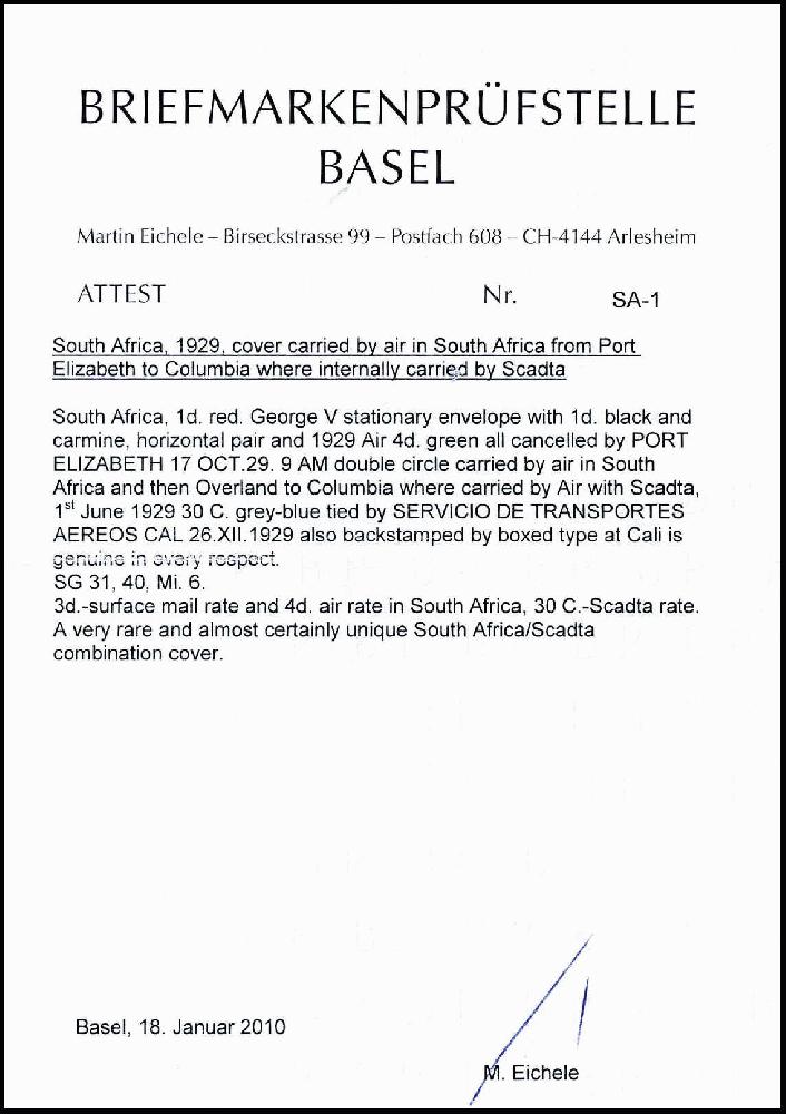 | Zusatzinformationen und Suchstichworte: | Württembergisches Auktionshaus 140. Versteigerung Auktionstermin: 17. - 18. Juni 2022 Los 1055 + Südafrika 4 P. grün mit Zusatzfrankatur auf Ganzsachenumschlag 1 P. karmin von Port Elizabeth nach Kolumbien. Dort weitergeleitet mit Scadta 30 C. blau nach Cali. Sehr seltene Kombination einer Südafrika-Frankatur mit Scadta-Marke und lt. Attest Eichele vermutlich Unikat. Ausruf 2.500,00 EUR |