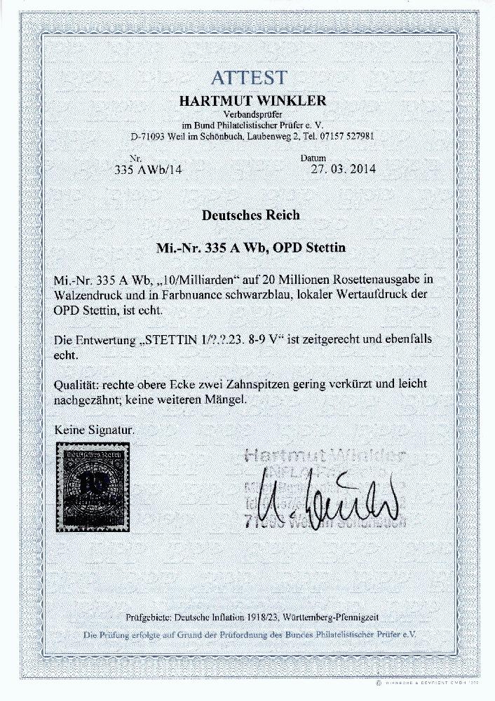 | Prüfer: | Winkler, Hartmut (BPP (Bund Philatelistischer Prüfer)) |