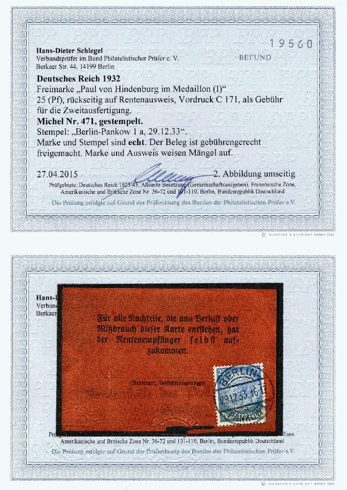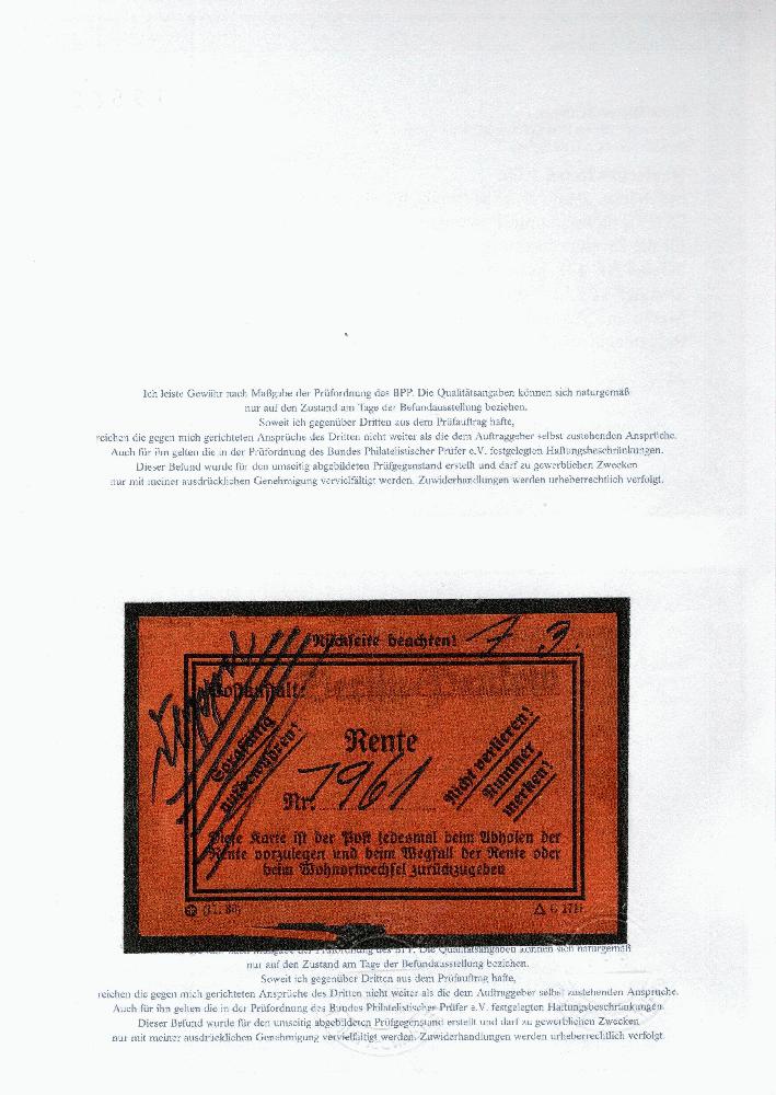 | Zusatzinformationen und Suchstichworte: | Georg Bühler 28. Fern-Auktion Auktionstermin: 28. April 2022 Los 2697 Deutsches Reich, 1923/32 Weimarer Republik EF auf Rentenausweiskarte 1933, sehr seltene Verwendung, Fotobefund Schlegel (Marke u. Karte kl. Mängel) Ausruf 180,00 EUR |