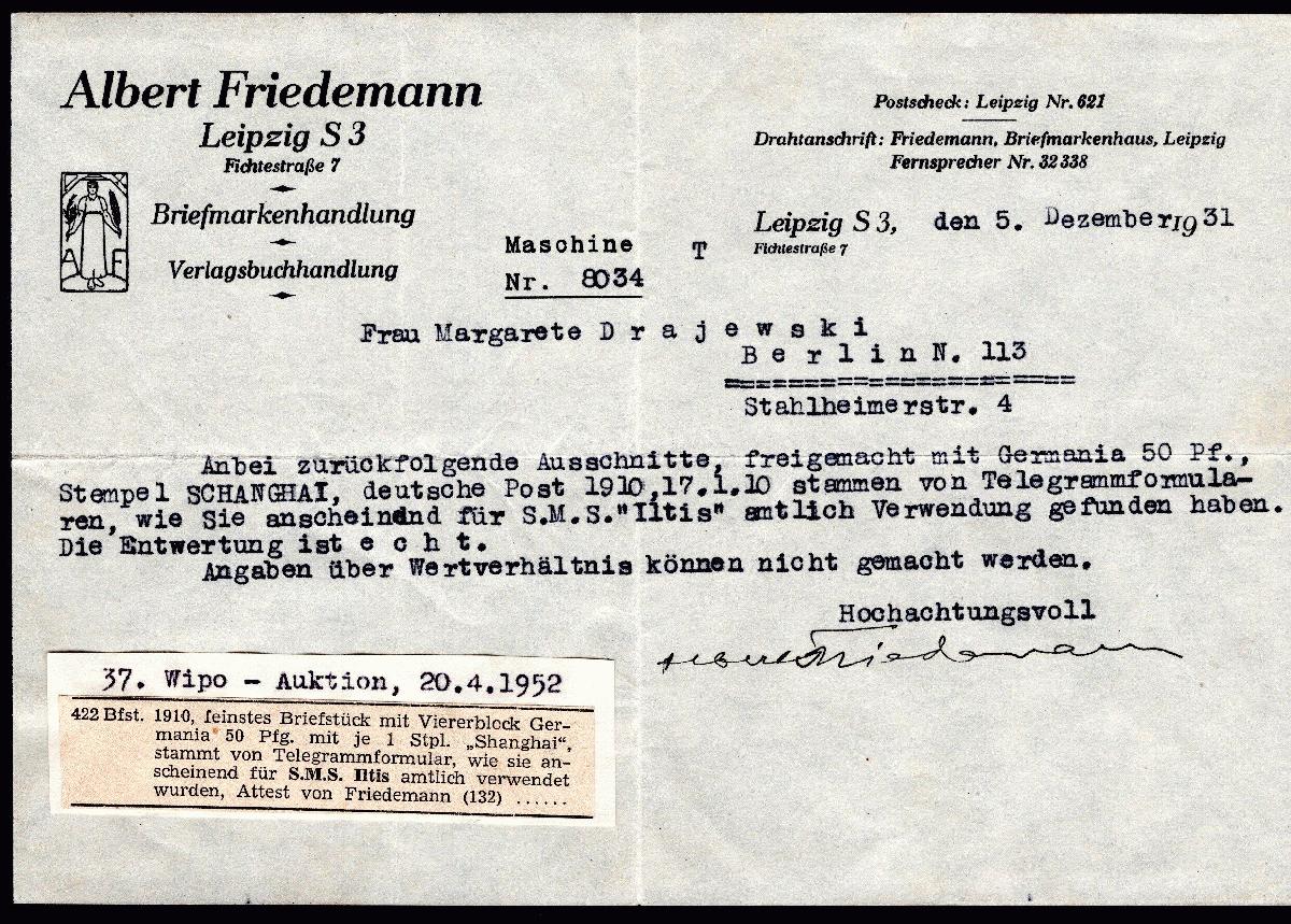 | Zusatzinformationen und Suchstichworte: | Georg Bühler 28. Fern-Auktion Auktionstermin: 28. April 2022 Los 2921 Deutsche Auslandspost China DR 91 Viererblock als Mitläufer auf Feldtelegramm-Ausschnitt der S.M.S. Iltis mit K1 "Schanghai 17.1.10", Befund Friedemann, Kab Ausruf 300,00 EUR |