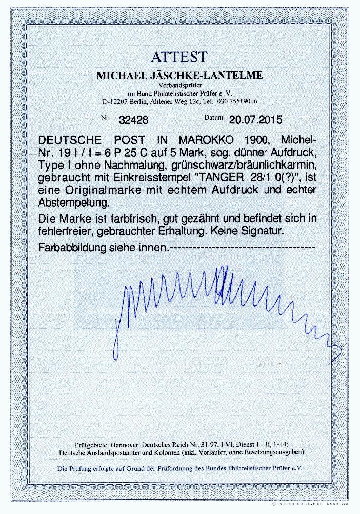 | Prüfgebiet: | Deutsche Auslandspostämter Marokko |