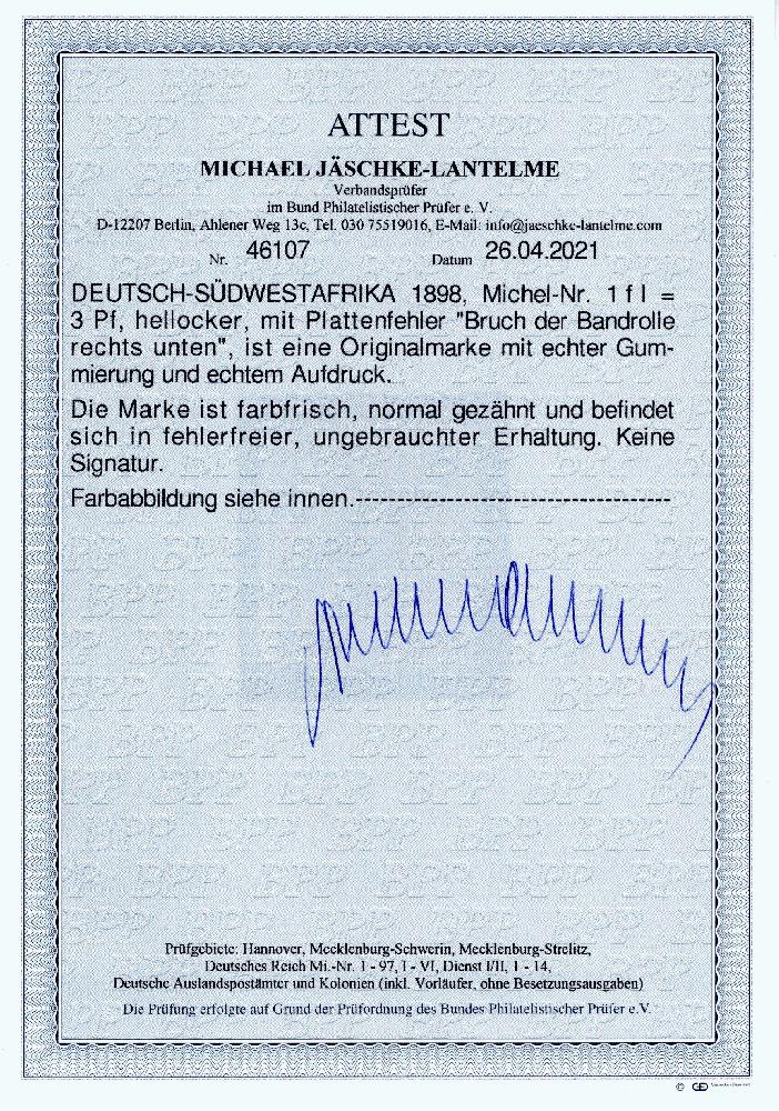 | Zusatzinformationen und Suchstichworte: | Georg Bühler 28. Fern-Auktion Auktionstermin: 28. April 2022 Los 3065 Deutsche Kolonien Südwestafrika Mit Plattenfehler "Bruch der Banderole rechts unten", Kab., Fotoattest Jäschke-L., selten! Preis wurde vom Auktionshaus nicht zur Verfügung gestellt! |