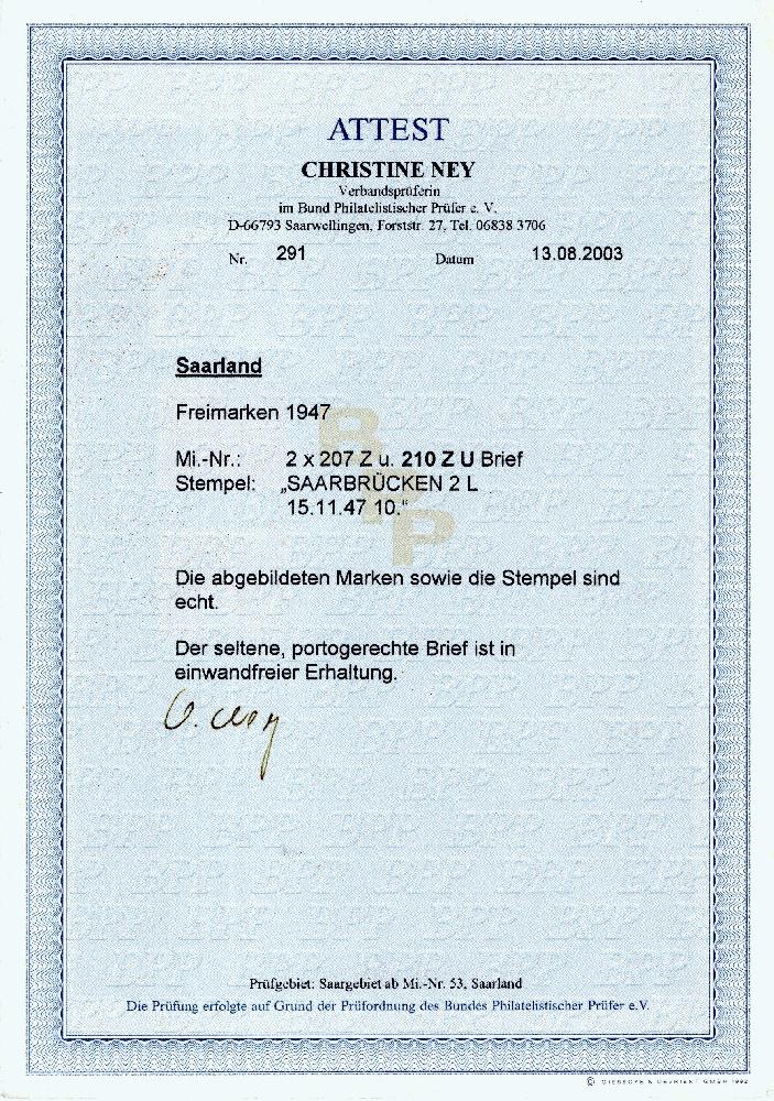 | Prüfgebiet: | Saarland (ab Mi-Nr. 206) |