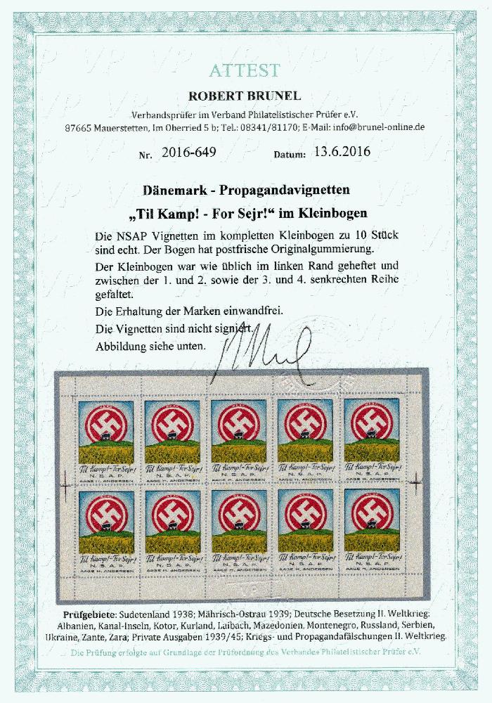 | Zusatzinformationen und Suchstichworte: | Georg Bühler 28. Fern-Auktion Auktionstermin: 28. April 2022 Los 3382 Deutsche Besetzung II. WK Dänemark Kpl. KLB der Propagandavignette "Til Kamp! - For Sejr", Fotoattest Brunel, Kab Ausruf 1.000,00 EUR |