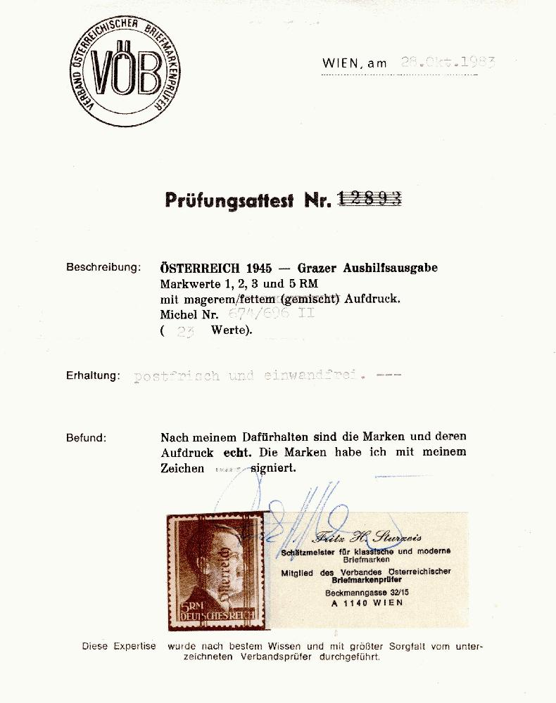 | Prüfer: | Sturzeis, Fritz (VÖB (Verband Österreichischer Briefmarkenprüfer)) |