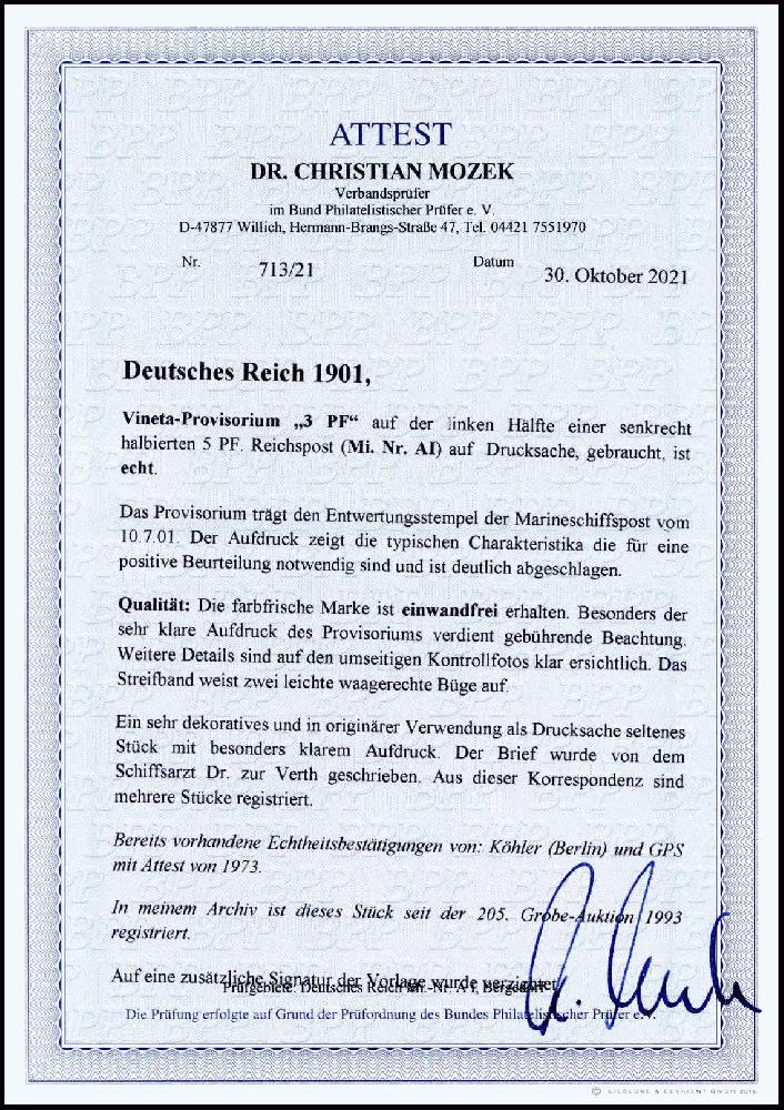 | Zusatzinformationen und Suchstichworte: | Württembergisches Auktionshaus 140. Versteigerung Auktionstermin: 17. - 18. Juni 2022 Los 4202 Deutsches Reich 3 PF. a. halbierter 5 Pfg., linke Hälfte, "Vineta-Provisorium", tadelloses Exemplar auf aktenfrischem, gef. Streifband mit zwei ideal aufges. Stempeln K.D.MARINE-SCHIFFSPOST No.1 ("Vineta") 10/7 01 aus bekannter Korrespondenz, geschrieben von dem Schiffsarzt Dr. zur Verth nach Telgte. Ausnehmend schönes Ganzstück dieser Deutschland-Rarität, sign. Köhler, Fotoattest GPS sowie neuestes Fotoattest Mozek BPP. Katalogpreis: 22.000,- Ausruf 12.000,00 EUR |