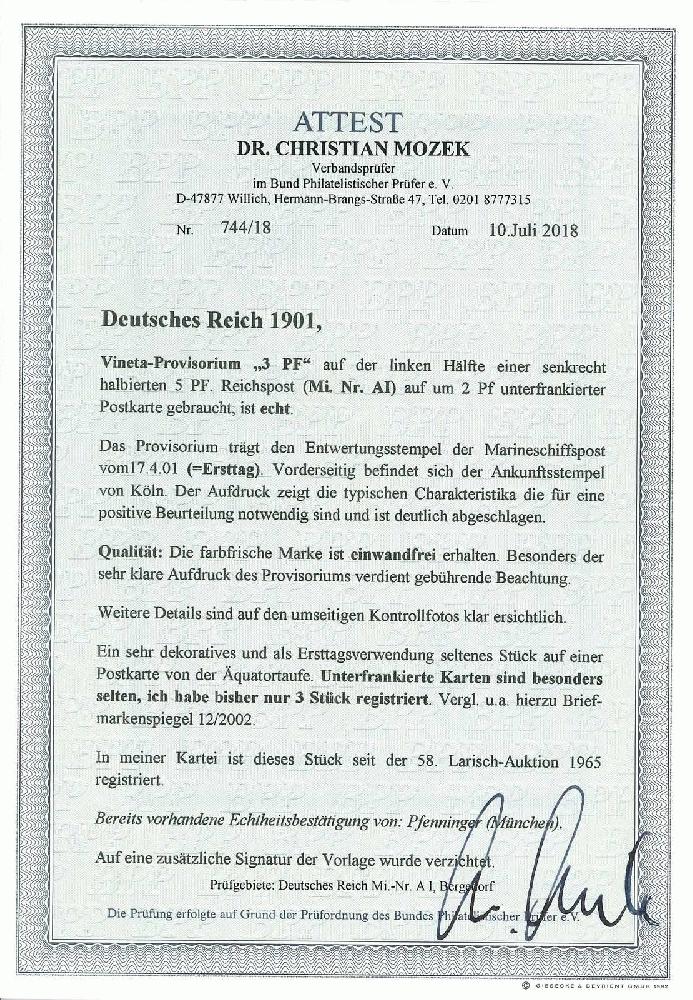 | Zusatzinformationen und Suchstichworte: | Rapp Auktion 2022 Auktionstermin: 2. - 7. Mai 2022 Los 955 Deutsches Reich, Germania Reichspost Vineta-Provisorium "3 PF", linke Hälfte einer senkrecht halbierten 5 PF-Marke mit Marineschiffspoststempel vom Ausgabetag 17.4.01 auf farbiger Bildpostkarte (Neptunsfeier Aequatortaufe) nach Köln mit vorderseitigem Ankunft-Stempel 13.5.01. Das korrekte Porto für eine Karte betrug 5 PF, bis heute sind lediglich 3 unterfrankierte Karten bekannt. Im Attest Mozek wird der klare Abdruck des Provisorium, die Ersttags-Verwendung und die hervorragende Erhaltung der Karte besonders erwähnt. Wir verweisen auch auf die Ausführungen des ehemaligen Experten Wolfgang Jakubek im Briefmarken-Spiegel 12/2002 (im Internet ersichtlich). Zuschlag 12.000,00 CHF |