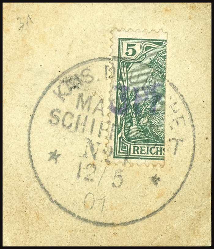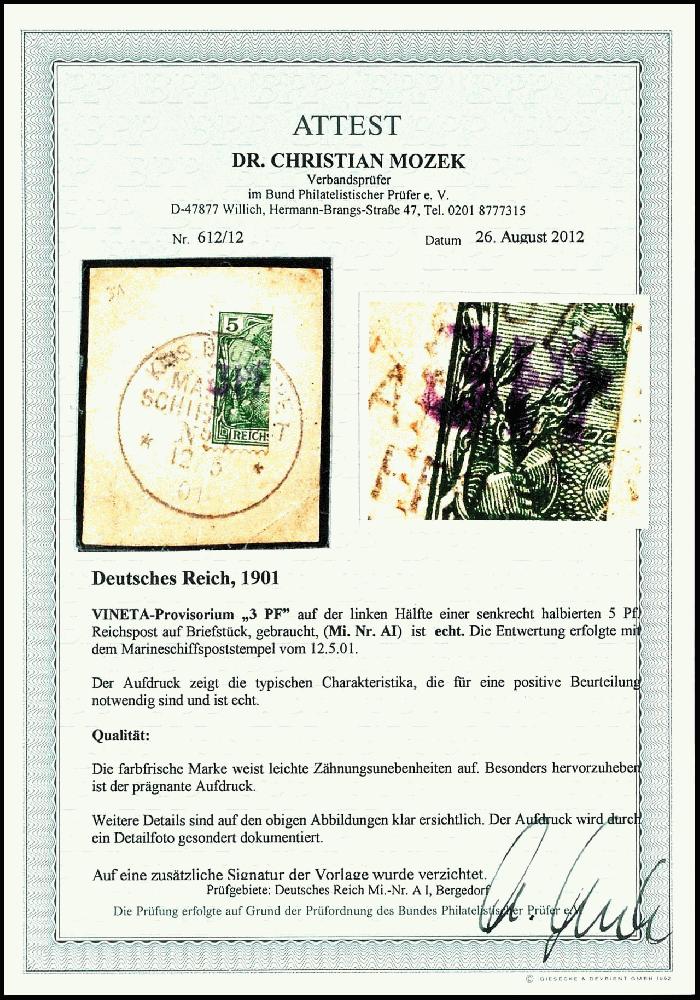 | Zusatzinformationen und Suchstichworte: | Dr. Reinhard Fischer 186. Auktion Auktionstermin: 18. - 21. Mai 2022 Los 1817 Deutsches Reich 3 Pf. auf 5 Pfg Germania, linke Hälfte sog. Vineta-Provisorium, sehr klarer Handstempelaufdruck, klar gestempelt mit Marine-Schiffspoststempel vom 12.5.01 auf Briefstück, Fotoattest Dr. Mozek BPP (2012): "Die farbfrische Marke weist leichte Zähnungsunebenheiten auf. Besonders hervorzuheben ist der prägnante Aufdruck.", Mi. 10.000.- Zuschlag 3.400,00 EUR |