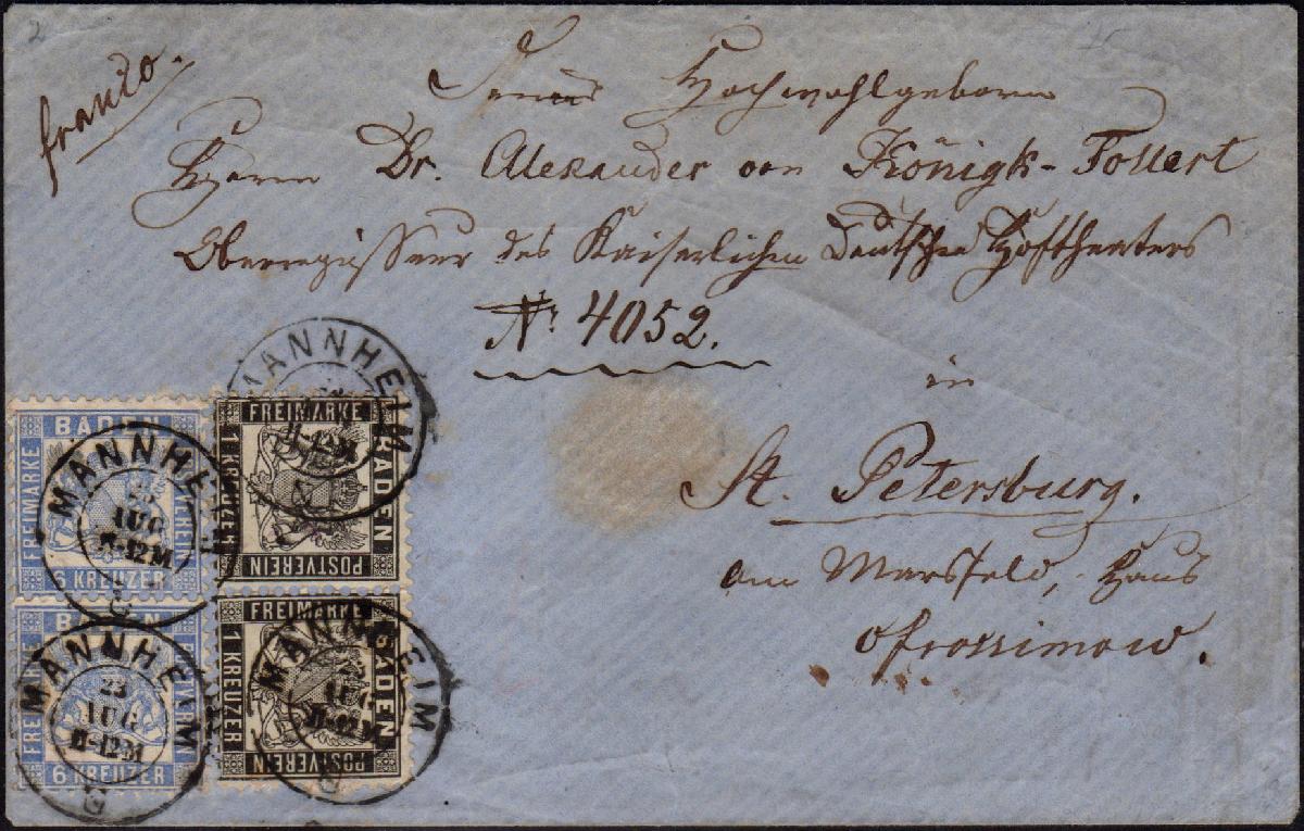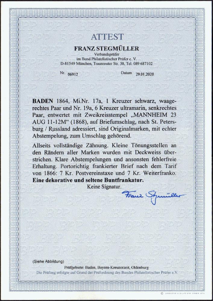 | Zusatzinformationen und Suchstichworte: | 108. Briefmarken Lenz Auktion Auktionstermin: 29. April - 5. Mai 2022 Los 3138 Altdeutschland Baden 1 Kr., waagr. Paar und 6 Kr. ultramarin im senkr. Paar als Viererblock geklebt auf schönem blauem Brief nach St.Petersburg, klar und sauber aufges. K2 MANNHEIM 23/8 (1868). Einige getönte Zahnspitzen sind mit Deckweiß übermalt, ansonsten in tadelloser Erhaltung. Eine seltene Frankatur-Kombination, Fotoattest Stegmüller BPP. Ausruf 400,00 EUR |