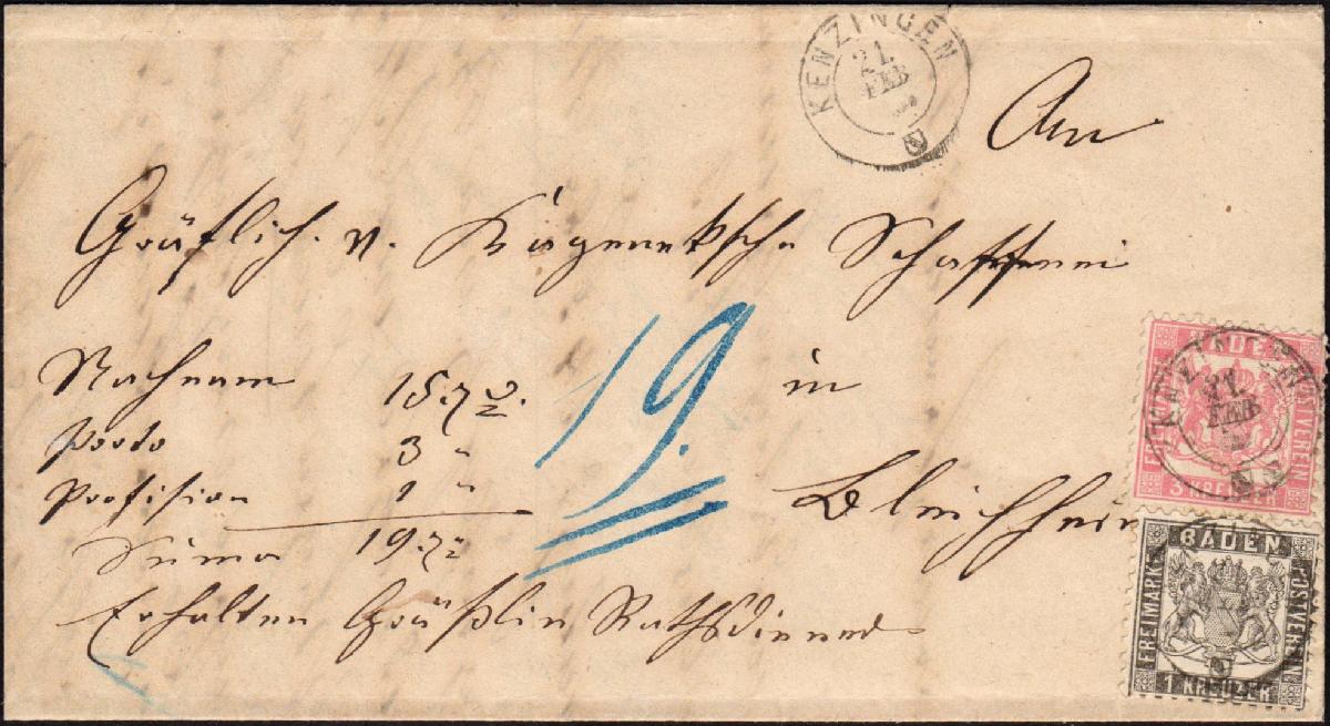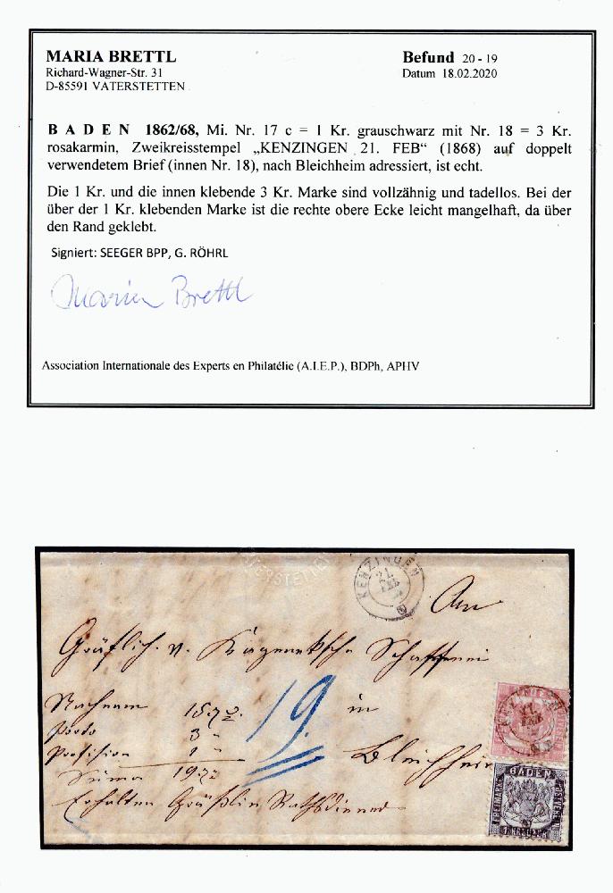 | Zusatzinformationen und Suchstichworte: | 108. Briefmarken Lenz Auktion Auktionstermin: 29. April - 5. Mai 2022 Los 3140 Altdeutschland Baden 1 Kr. grauschwarz, Luxusstück zusammen mit etwas bestoßener 3 Kr. rosa, beide mit genau zentr. K2 KENZINGEN auf schönem, doppelt verwendetem Nachnahmebrief (innen weitere, tadellose 3 Kr. rosa), Fotobefund Brettl. Ausruf 250,00 EUR |