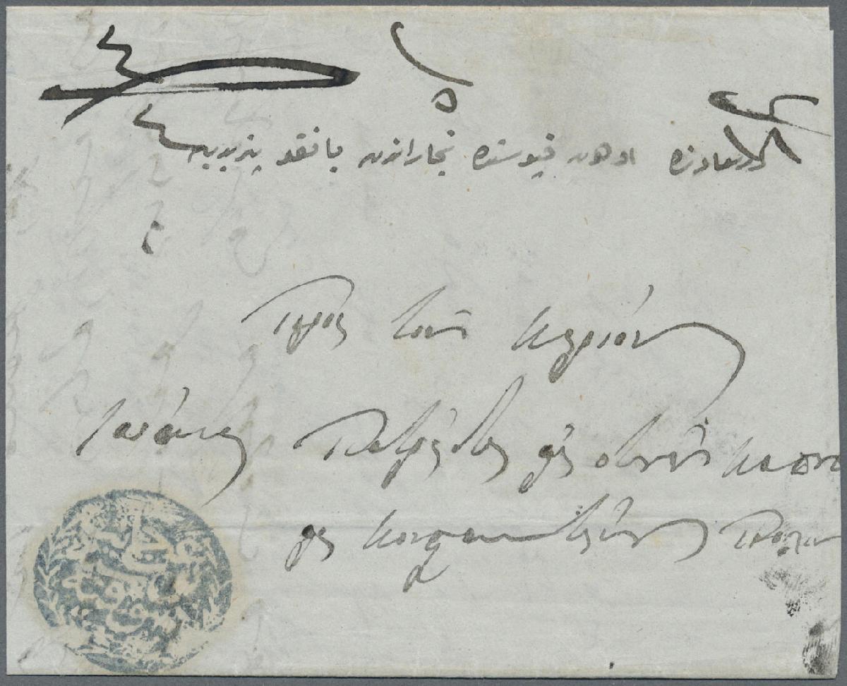 | Zusatzinformationen und Suchstichworte: | Christoph Gärtner 53. Auktion Los 1825 Bulgarien 1859, Brief aus Sofia nach Konstantinopel innen datiert 20 April 1860 mit arabischen negativ An Canib-i Posta-i Sofya 259 Handstempel in schwarz (Coles und Walker fig. 73). Gewicht 4 Dirhem/Postgebühr 4 Piaster und 5 Para handschriftlich oben, Attest Arsman TFDF 1996 Ausruf 80,00 EUR |