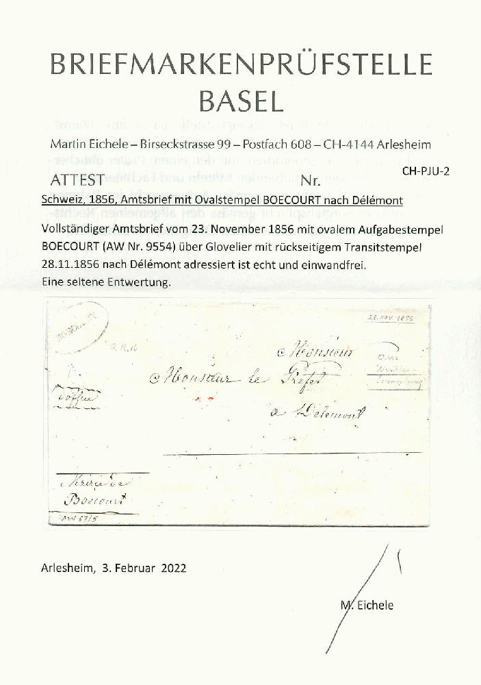 | Zusatzinformationen und Suchstichworte: | Rapp Auktion 2022 Auktionstermin: 2. - 7. Mai 2022 Los 198 Schweiz Vorphilatelie Vollständiger Amtsbrief vom 23. November 1856 mit ovalem Aufgabestempel BOECOURT (AW 67/9554) mit Transitstempel GLOVELIER 28.Nov.56 nach Delémont mit Ankunftstempel. Ein sehr seltener Stempel! Attest Eichele Zuschlag 200,00 CHF |