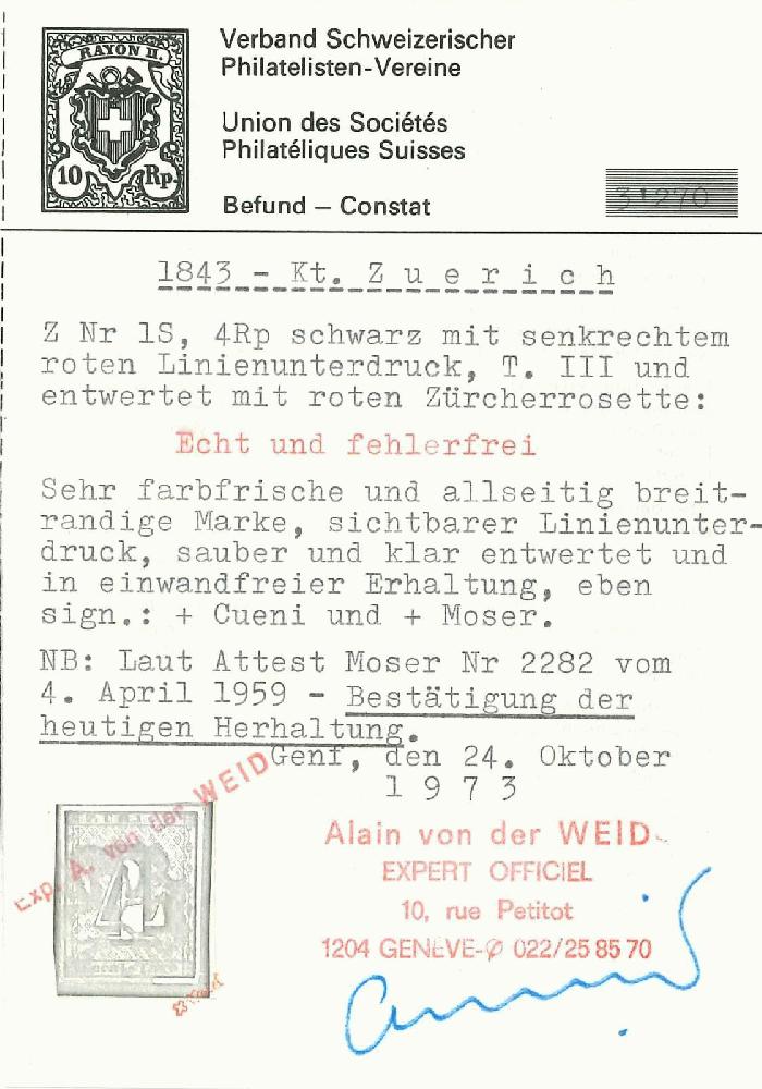 | Prüfer: | von der Weid, Alain (SBPV / ASEP (Schweizerischer Briefmarken-Prüfer-Verband)) |